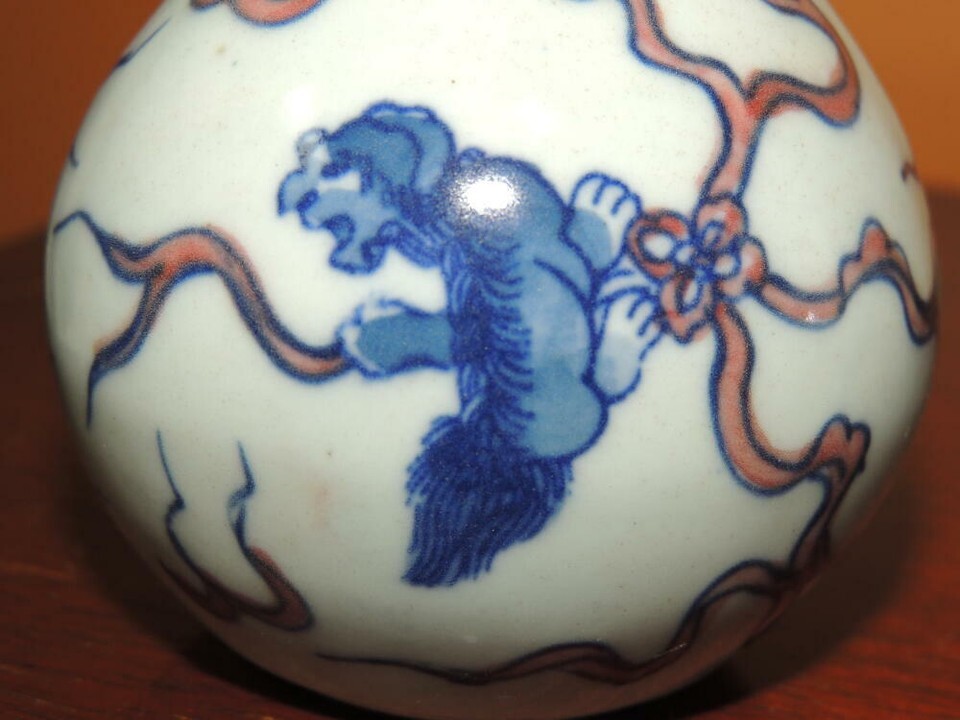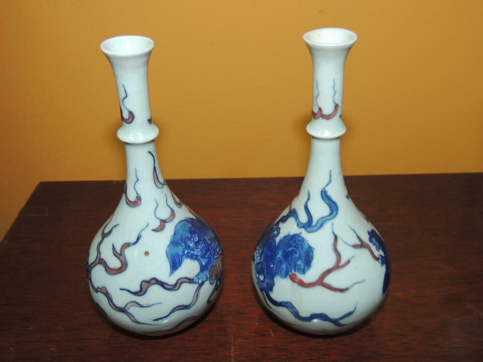 - Pair Bottle Vase 6"+ Hand Painted Blue Red Foo White Kangxi Leaf Mark Antique