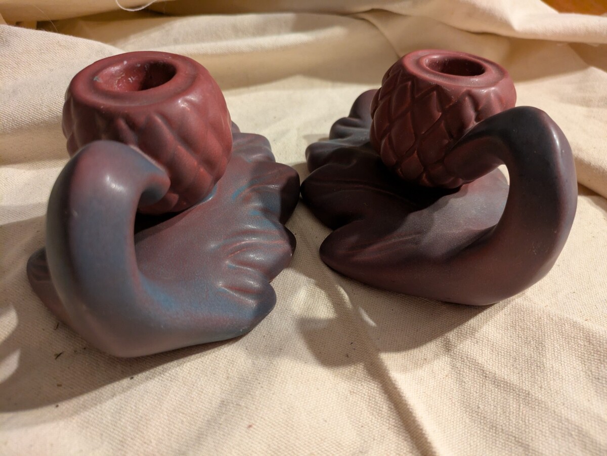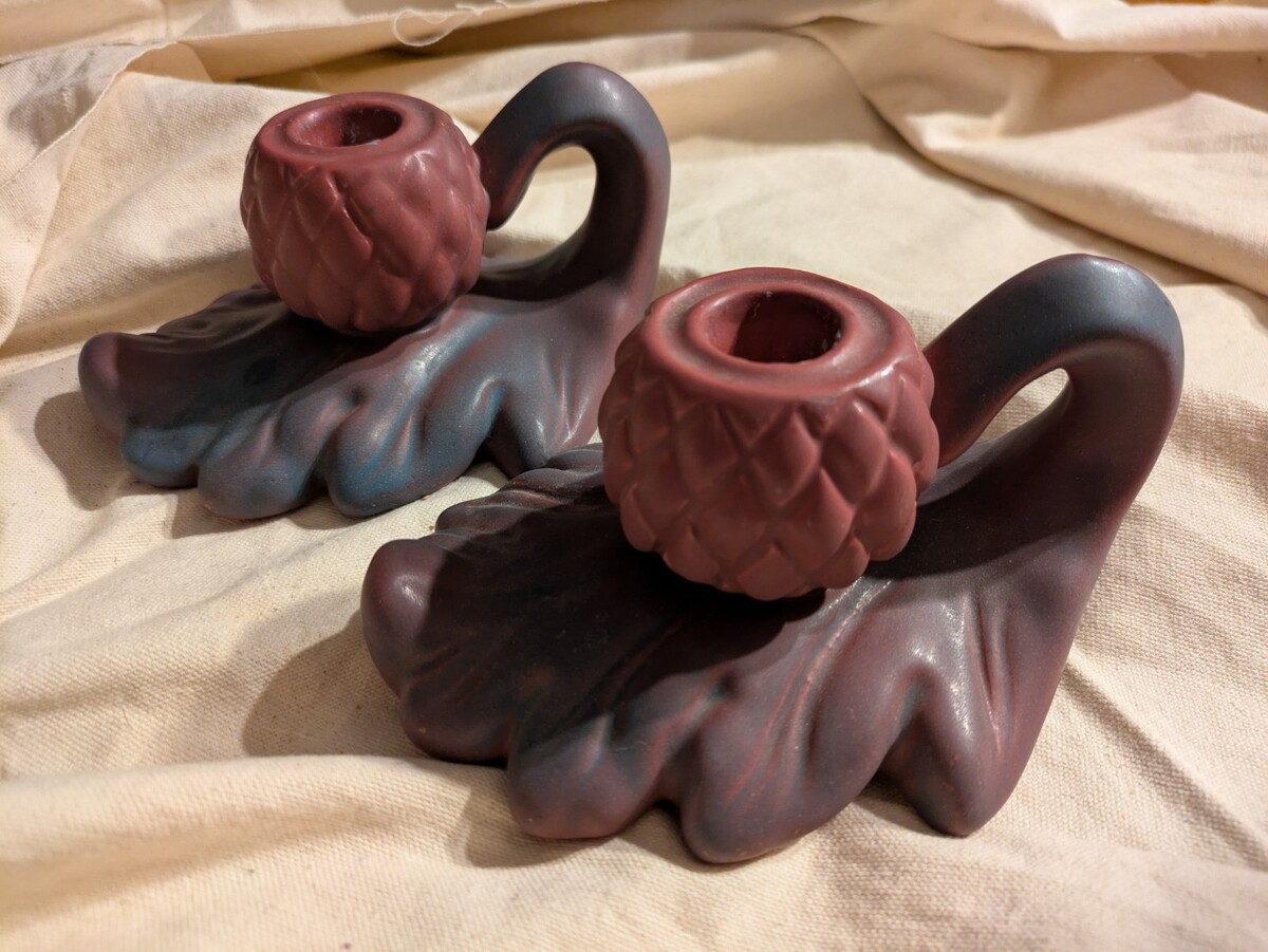- Pair Of Van Briggle Pottery Acorn Leaf Candle Holder Handle Matte Purple 7x 4