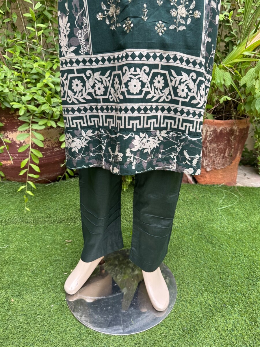 Pakistani Dark Green Printed Straight Shirt 3PCS Lawn Suit w/ Threadwork ,M