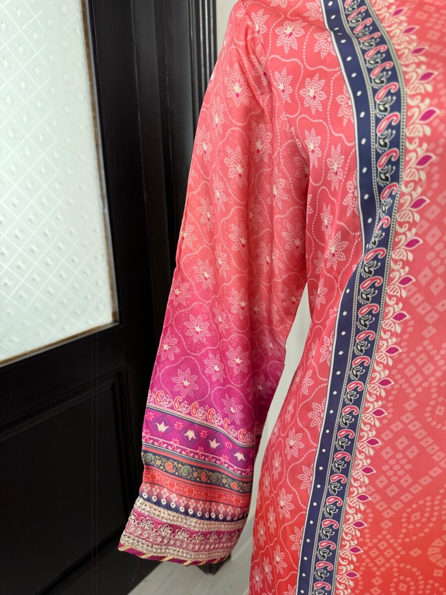 ? Pink shamoz silk straight style shirt with fancy thread embroidery lace on neck line , chunri print shirt.