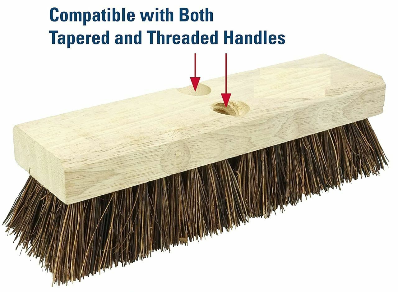 (1) NEW 12" length (12 inches = 1 foot) WOOD BLOCK REPLACEMENT BROOM HEAD OF PALMYRA NATURAL BRISTLES BY BY TOUGH GUY BRUSH MPN 4KNA8A. THIS IS A NEW REPLACEMENT HEAD ONLY, REQUIRING A STANDARD THREADED HANDLE or TAPERED HANDLE, NOT INCLUDED. THIS STIFF DECK SCRUB BRUSH HEAD REPLACEMENT IS 12" IN LENGTH WITH 2" length ALL NATURAL PALMYRA BRISTLES, INDICATED FOR USE DRY OR WET CLEANING OF DECKS, ESPECIALLY UNEVEN SURFACES LIKE SIDEWALKS, WOOD, BRICK, CONCRETE, SIDING, SCRUBBING WALLS, POOL AND MARINE PROJECTS, BOATERS LOVE PALMYRA SINCE IT WILL NOT SCRATCH. THESE PALMYRA BRISTLES ARE OFTEN REQUIRED FOR SPECIFIC AGGRESSIVE SCRUBBING APPLICATIONS. THE NATURAL PALMYRA BRISTLES HAVE SCRUBBING PROPERTIES UNIQUE TO THE PALMYRA BRISTLE, LESS SCRATCHING FOR EXAMPLE, WORKS GREAT ON UNEVEN SURFACES, etc. THE 4" length BRISTLES ARE MEDIUM STIFF FIBERS, HEAT AND CHEMICAL RESISTANT, AN EXCELLENT CHOICE FOR FLOOR SWEEP AND SCRUBBING, PROVIDING GOOD DURABILITY AND BRISTLE RECOVERY. THE PALMYRA BRISTLE COMES FROM THE INDIA PALM TREE. YOU WILL RECEIVE ONE (1) TOUGH GUY BRAND 12" PALMYRA BRISTLE BROOM HEAD SHIPPED BY USPS.....