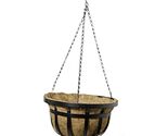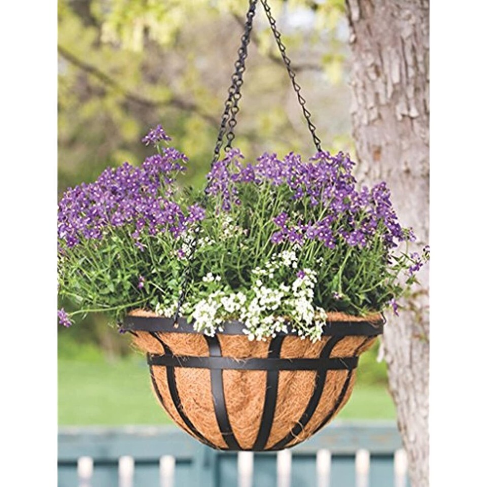 Panacea flat iron style hanging basket with decorative accents Contains flattened metal bars with a flared out opening. The generous hanging basket comes with a natural fiber coco liner to keep your plants healthy beautiful, coco liner keeps soil or other planting materials safe helps keep the soil aerated, the powder-coated finish prevents the planter from rust. This basket may be hung with The included hanging chain hook. Add a floral element to your porch using this flat iron series hanging basket. Use multiple baskets plants hung at different levels to create your own unique decorative effect. Size: 14" Finish: Black round flat iron style powder coated steel construction Includes coco fiber liner, chain, hook coco liner keeps soil or other planting materials safe helps keep the soil aerated powder-coated finish presents the basket from rust Use multiple baskets plants hung at different levels to create your own unique decorative effect.