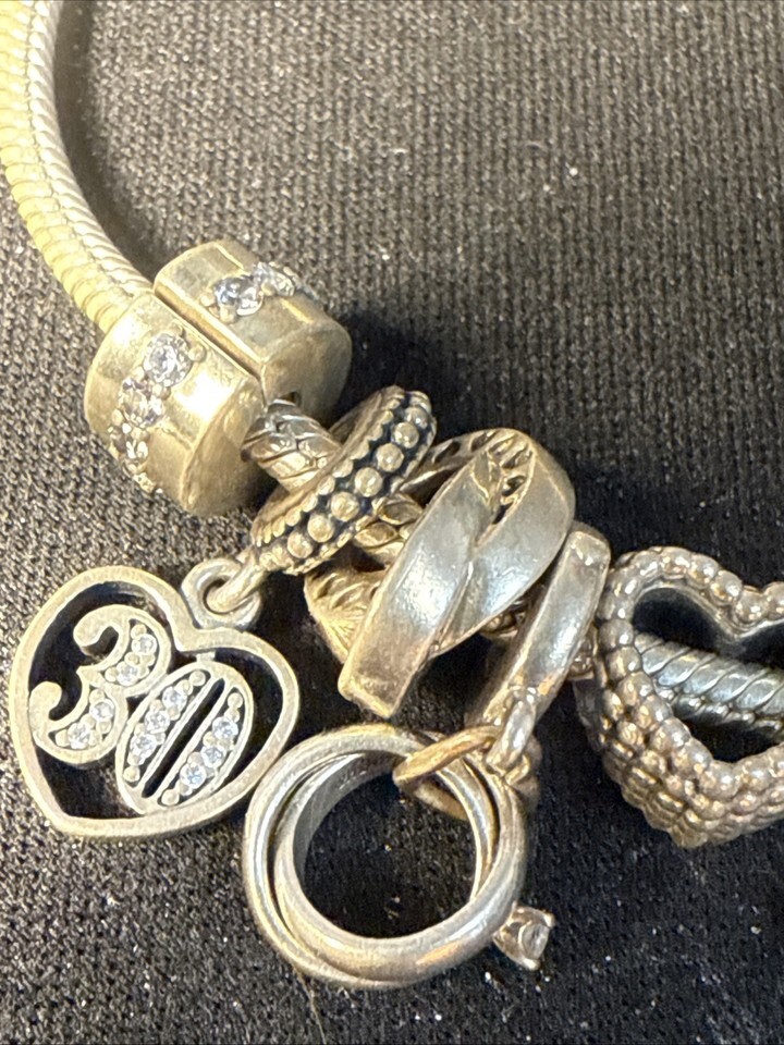 - PANDORA CHARM BRACELET WITH SIX CHARMS - Beautiful, Authentic Pandora Charms!!