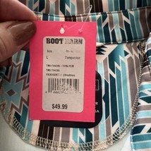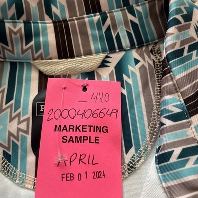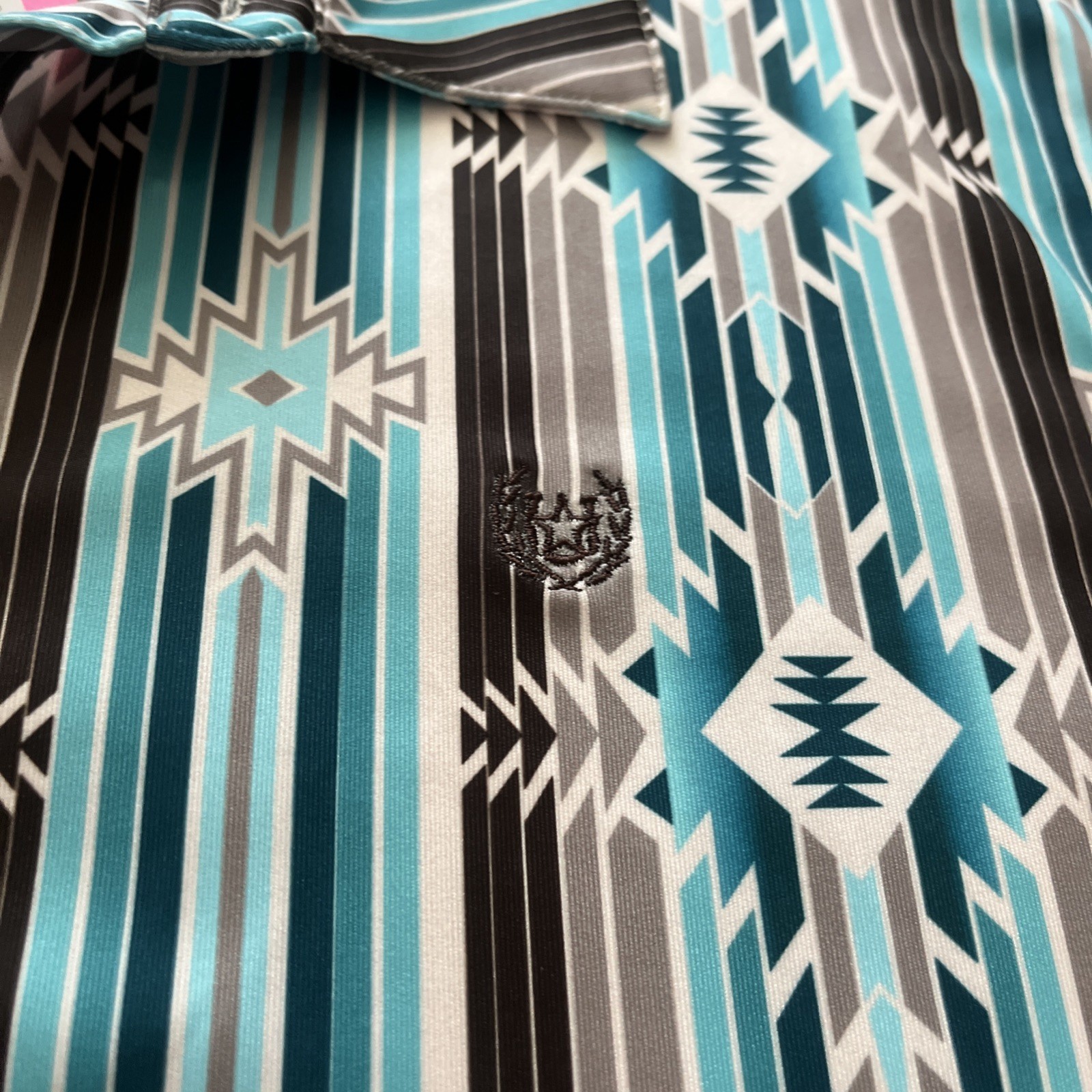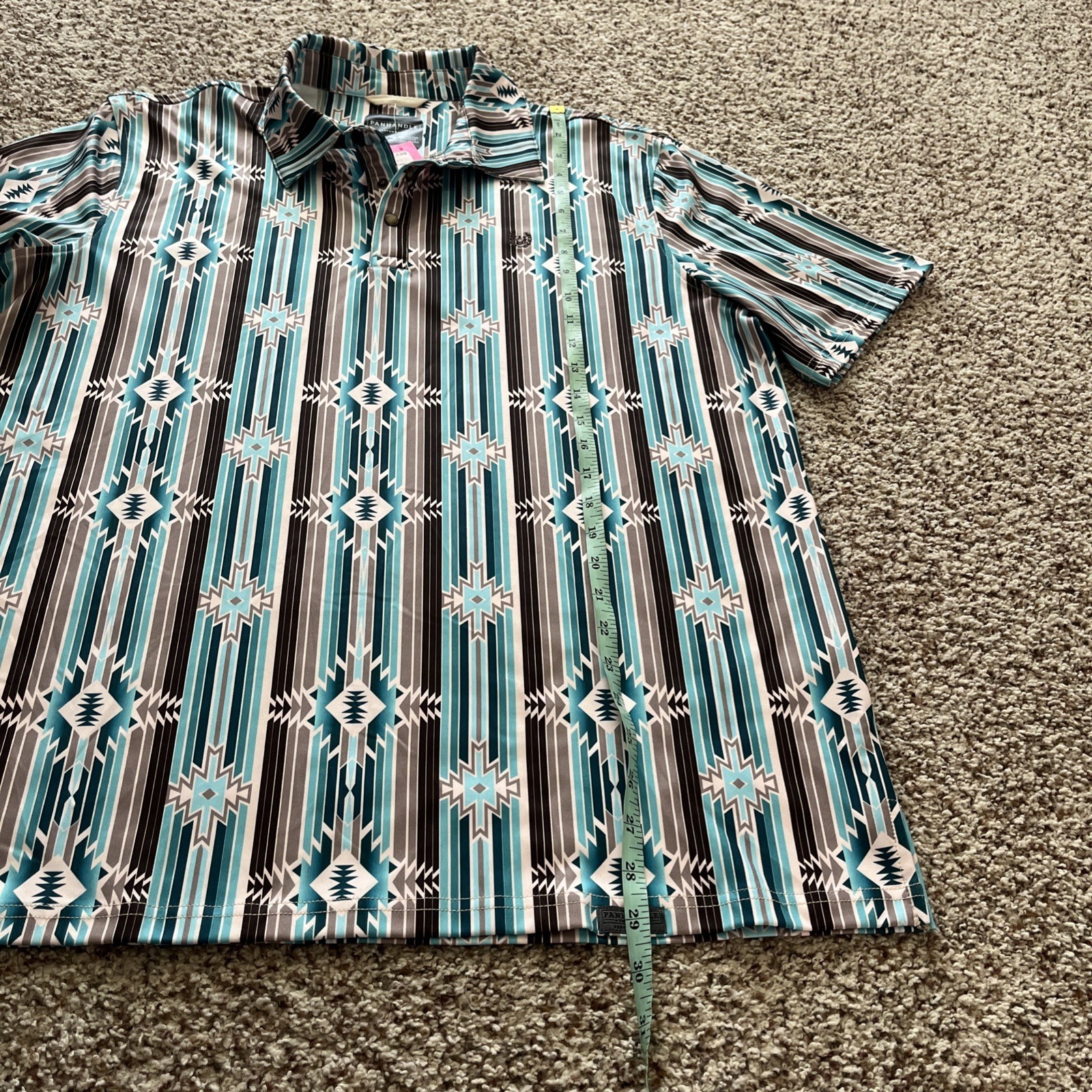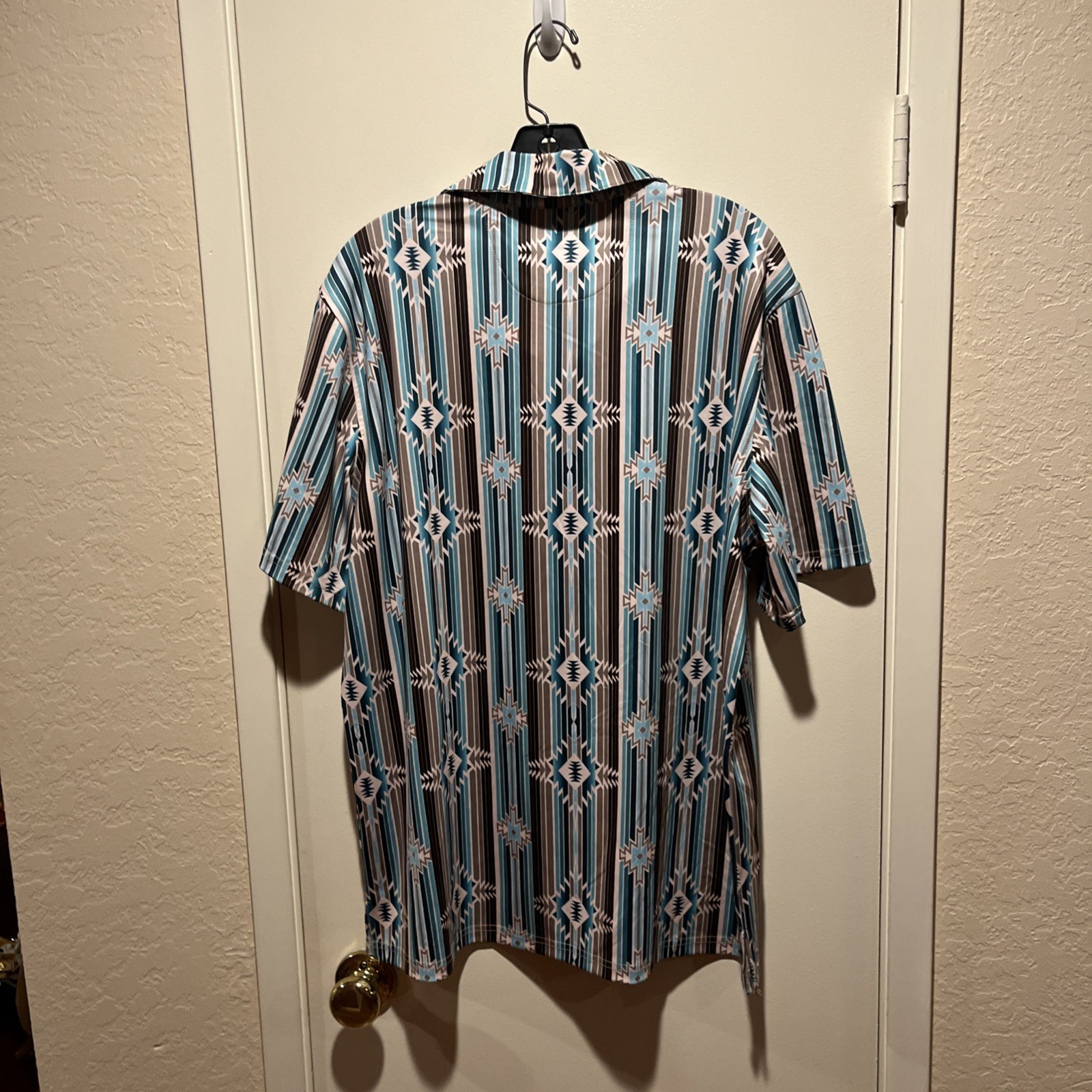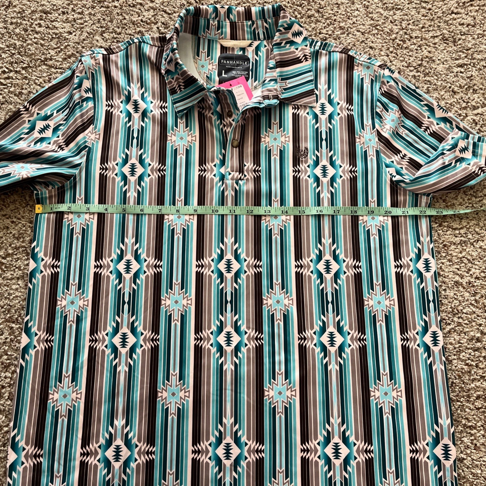 The Panhandle Performance Quarter Snap Western Aztec Turquoise Polo is a stylish and versatile addition to any man's wardrobe. This short sleeve polo features a collared neckline with a snap closure, making it perfect for casual occasions, parties, or even travel. The Aztec pattern in turquoise, teal, brown, beige, and cream colors adds a touch of Western flair, while the breathable spandex and polyester blend material ensures comfort during activities like walking, golf, or driving. Machine washable for easy care, this regular fit polo is a must-have for the fashion-conscious man. Shirt is new, with tag?shirt is a marketing sample from Boot Barn. See pics for measurements and condition.