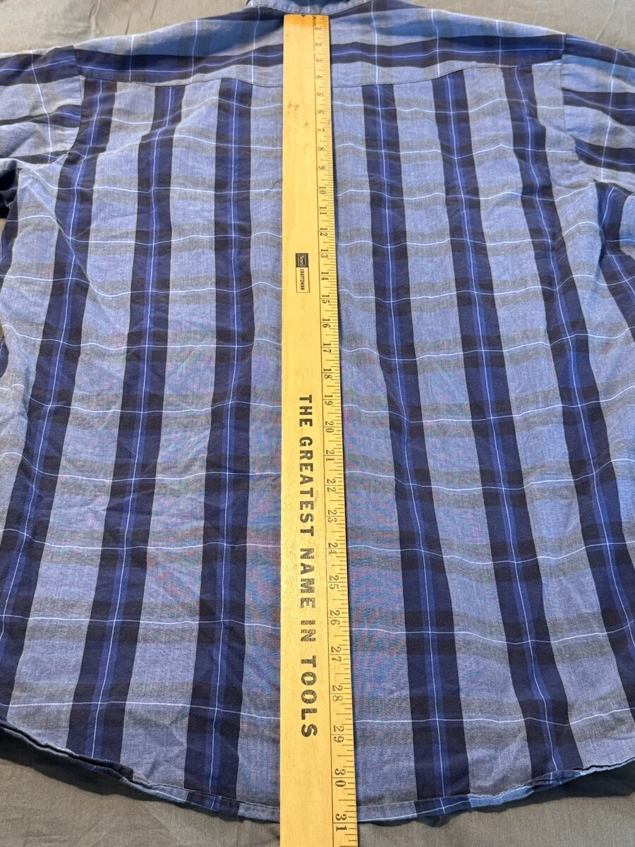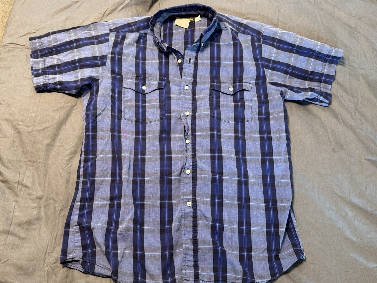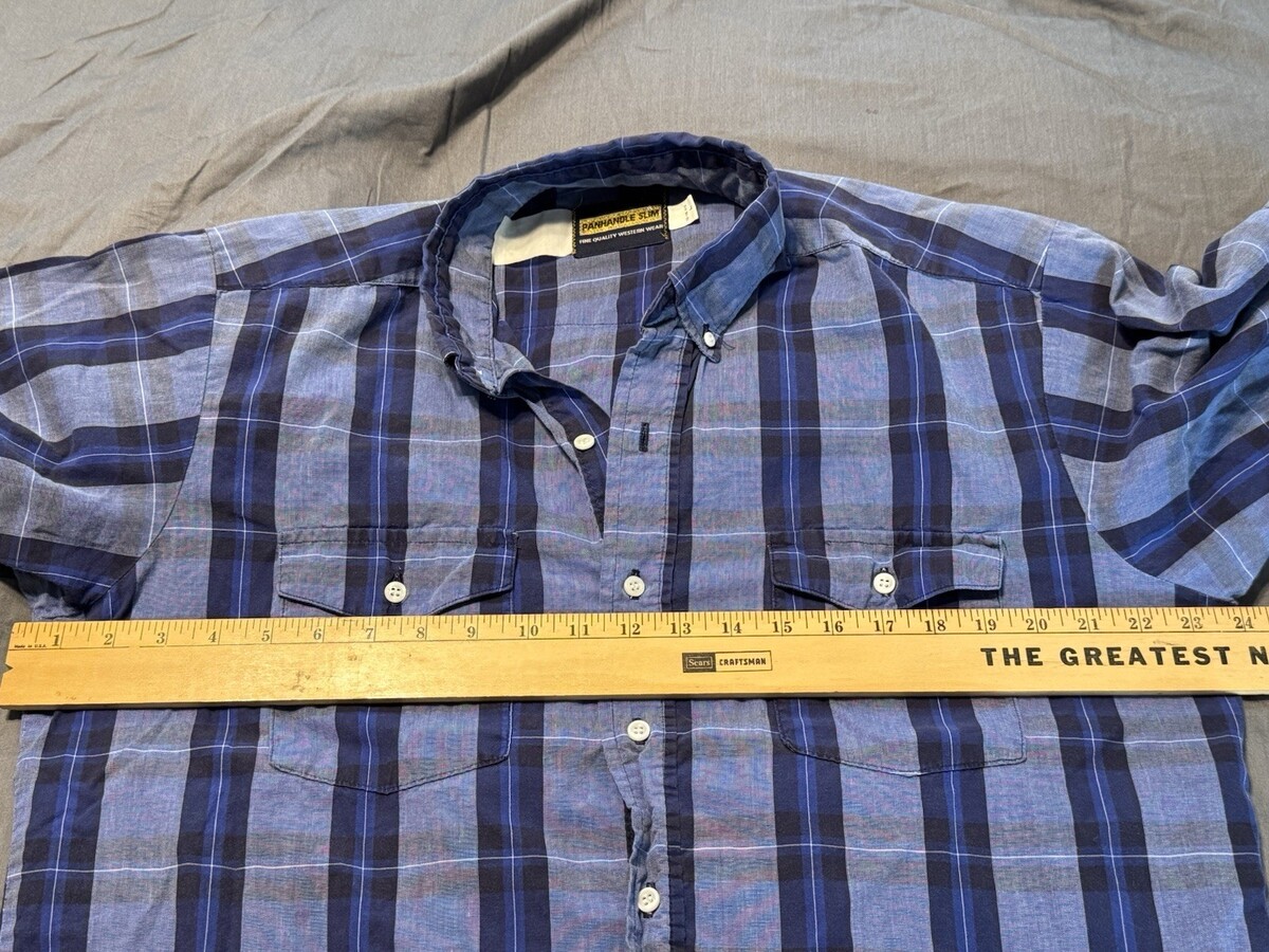 This Panhandle Slim short sleeve Western shirt delivers classic style with its bold blue plaid pattern and timeless workwear look. Made with the brand?s signature ?Fine Quality Western Wear? construction, it features two chest pockets with button flaps and a clean button-front closure (not snaps). Features: ? Size L ? Blue plaid design ? Short sleeves ? Button-front closure ? Two button-flap chest pockets ? Lightweight, easy-wear fabric ? Traditional Western-inspired styling Condition: Pre-owned and in good overall condition. Light wear consistent with normal use, no major flaws noted. Please review photos for the exact item and condition. A solid, dependable Western staple ready for its next home.