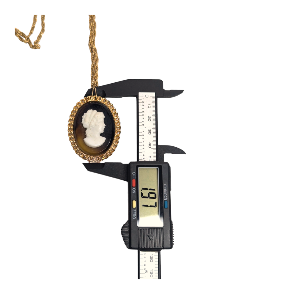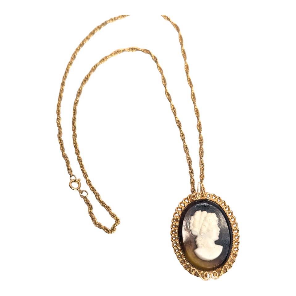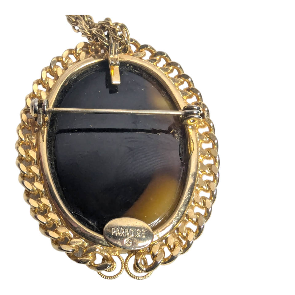 - Paradise Vtg Jewelry Root Beer Cameo Gold Tone Brooch Pin Pendant 24in Necklace