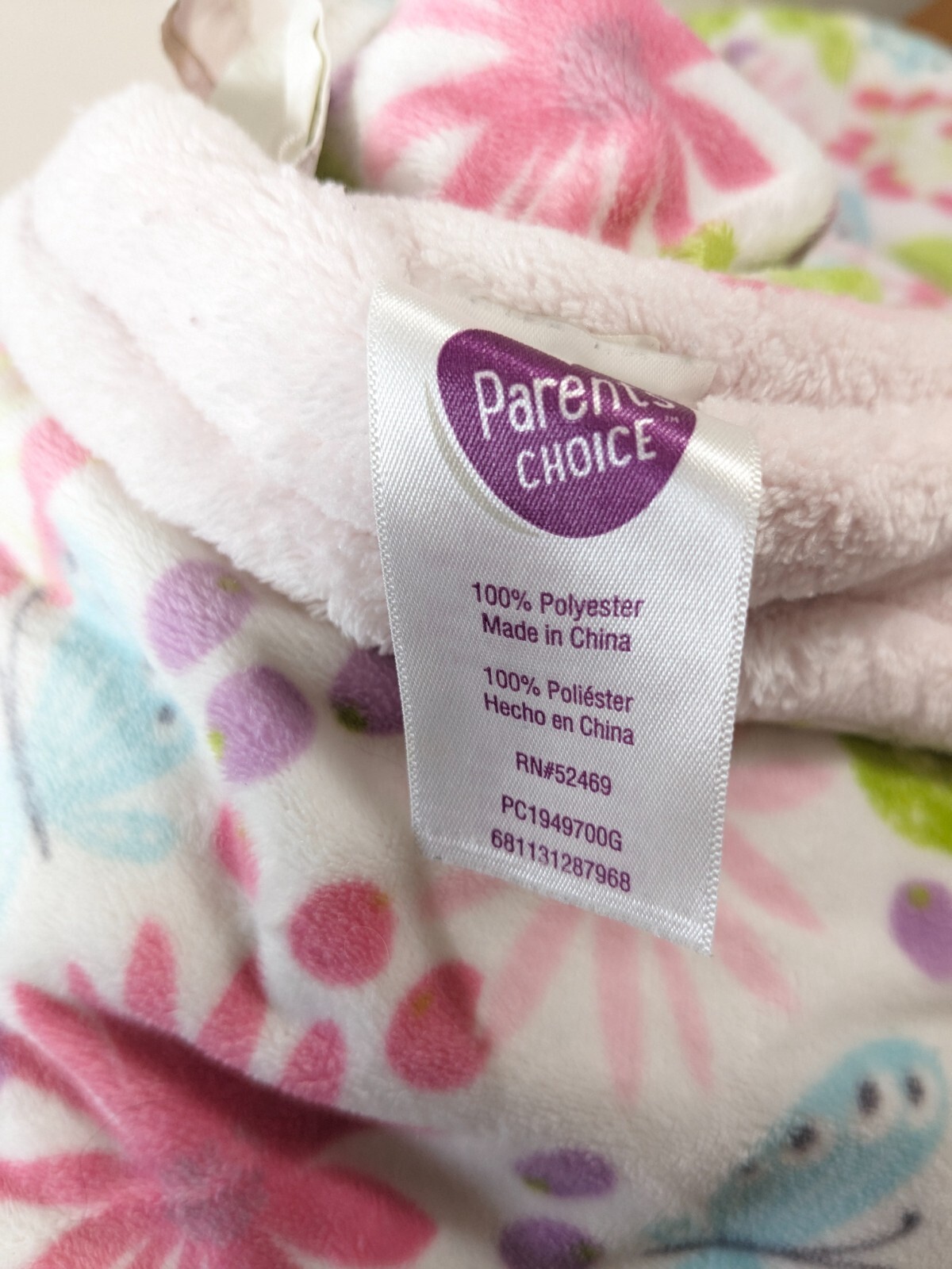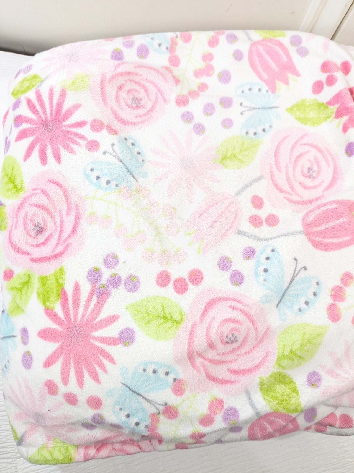 Parent's Choice Floral Butterfly Baby Blanket Tulip pink plush flowers Walmart Super cute soft blanket from Wal-mart. Lovely flowers such as tulips and roses plus butterflies. Print on one side and pink on the other. Good to very good condition.