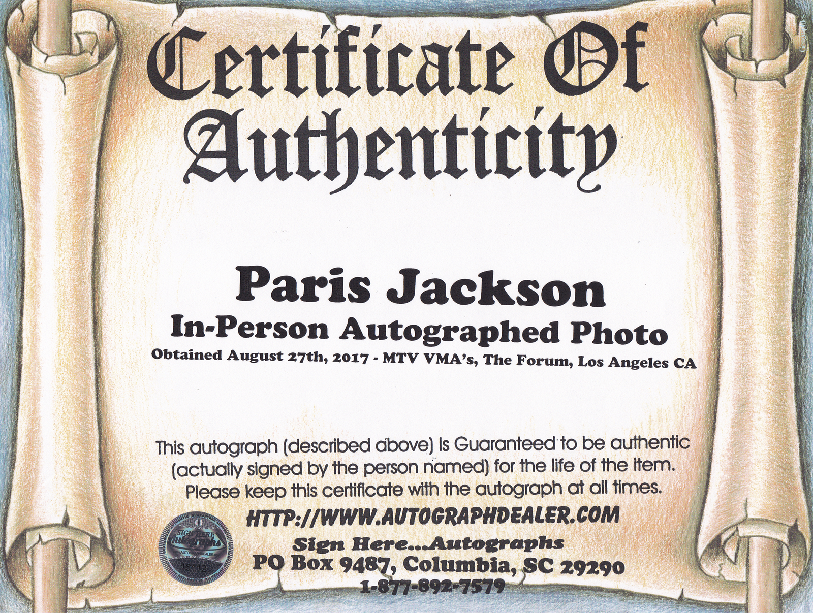 Perfect signed photo of Paris Jackson Includes a Certificate of Authenticity with the Date and Location she signed this photograph.