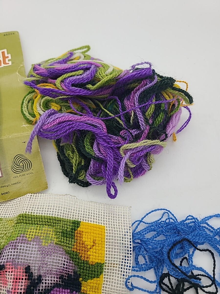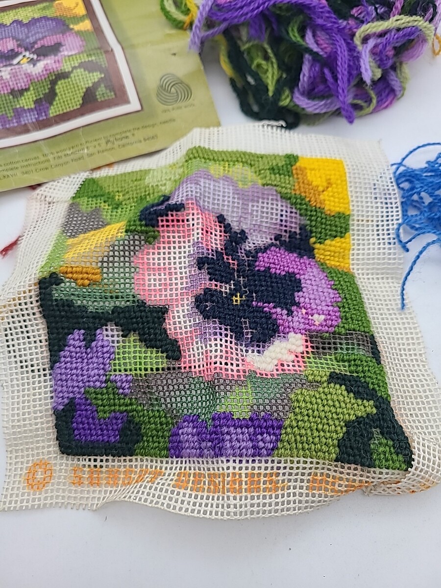- Partially Complete 1977 Sunset Jiffy Needlepoint Vibrant Pansy 5 x 5 Flower Yarn