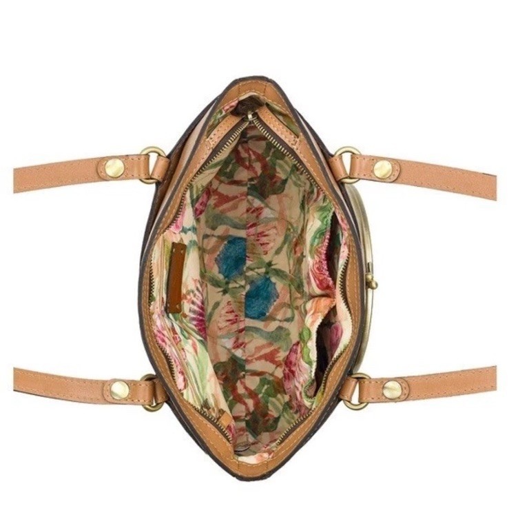 The Patricia Nash Poppy Tote Leather bag is a stylish and spacious handbag designed for women. Made from high-quality leather in a tan color, this tote features a unique design with seashells by the seashore scarf detail, adding a touch of sophistication to any outfit. The spacious interior and adjustable straps make it a practical and stylish accessory for everyday use.
