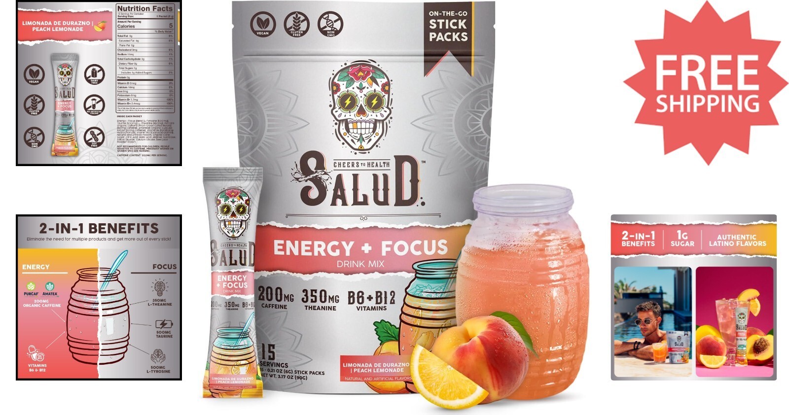 Experience the convenient, multipurpose boost of our 2-in-1 Energy Focus stick packs. Designed for on-the-go lifestyles, these packs deliver clean, balanced energy and enhanced focus through carefully selected ingredients proven to work. Unlike traditional sugary energy drinks, Salud transforms plain water into a delicious Agua Fresca with only 1g of added sugar and just 5 calories per serving, making it a health-conscious choice for mornings and workouts. Featuring dual organic caffeine sources?PurCaf and AmaTea?providing a balanced 200mg of caffeine, along with amino acids like L-Theanine, L-Tyrosine, and Taurine, it offers sustained energy without jitters or crashes. Plus, each serving supplies 100% of your daily needs of Vitamins B6 and B12, ensuring comprehensive support in every pack. To ensure fast and reliable delivery, we work with multiple fulfillment partners and suppliers. Depending on availability and location, your order may ship from different warehouses or arrive in packaging that varies from item to item. Tracking details are typically provided shortly after shipment, and customer satisfaction remains our top priority.