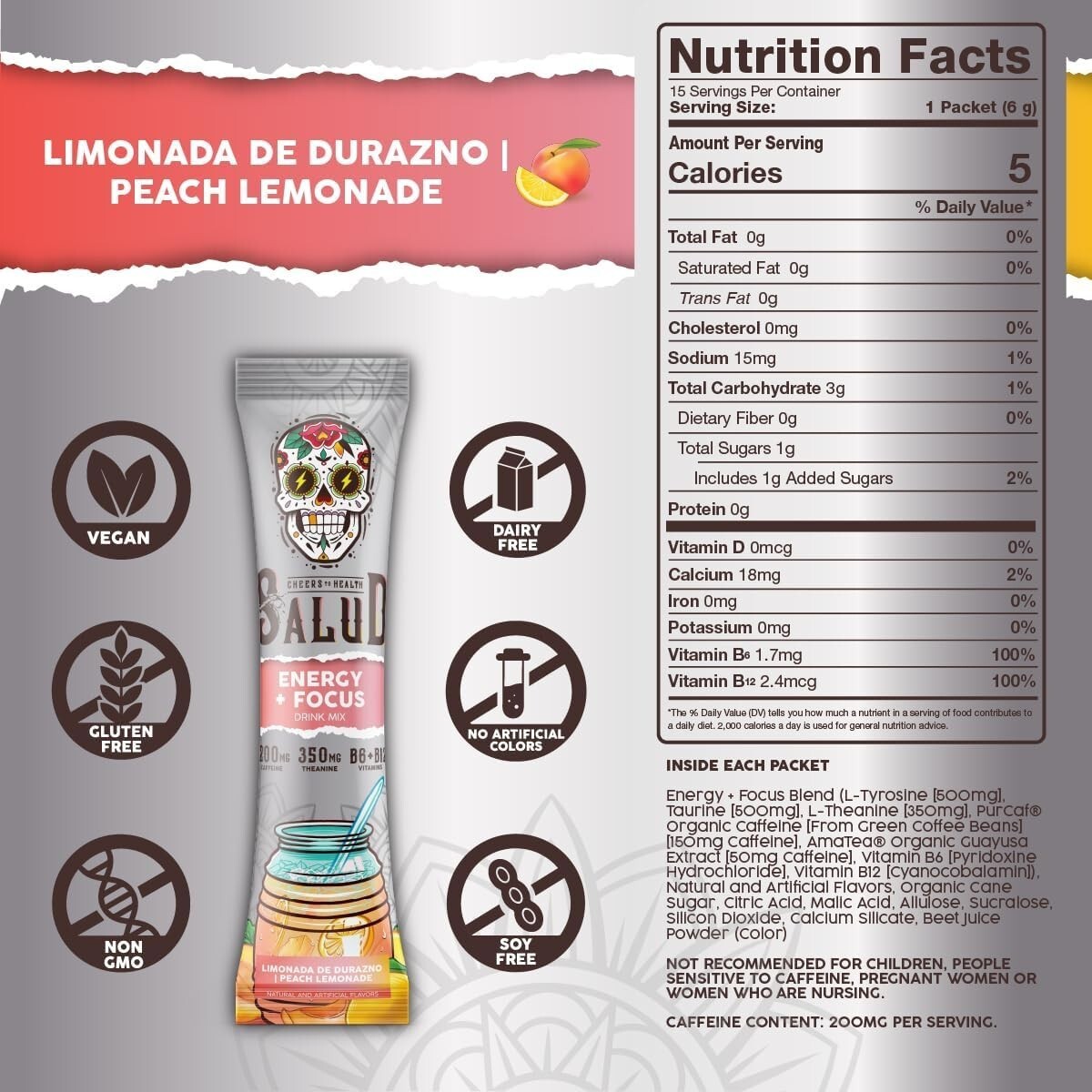- Peach Lemonade Salud Energy & Focus Drink Powder - Organic, , 15 Pack
