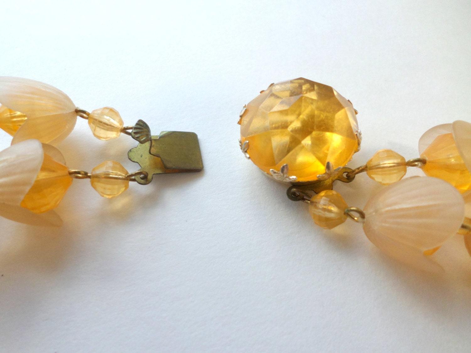?Style/Features: Transport yourself to sunny 1950s summers with this signed West Germany lucite treasure. Lightweight floral fantasy in translucent peachy-apricot glows in light. Molded petal beads with tiny matching spacers. Matching lucite clip earrings. Super lightweight for all day beach wear.