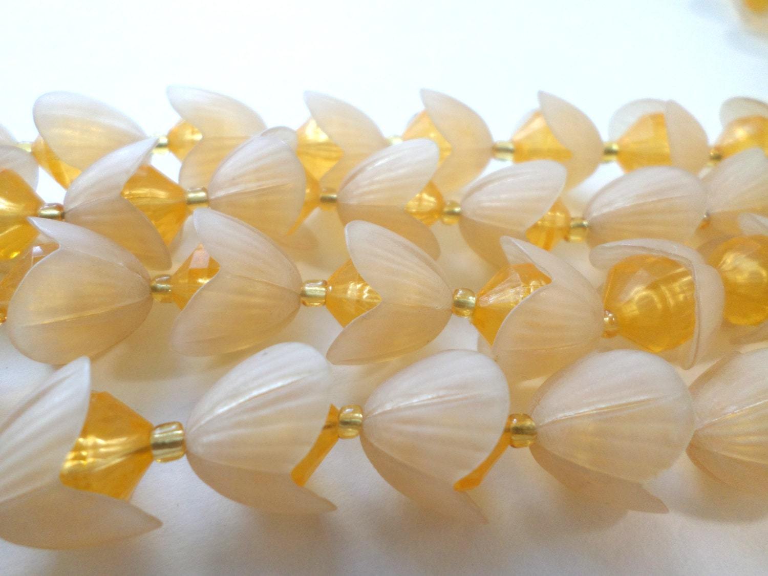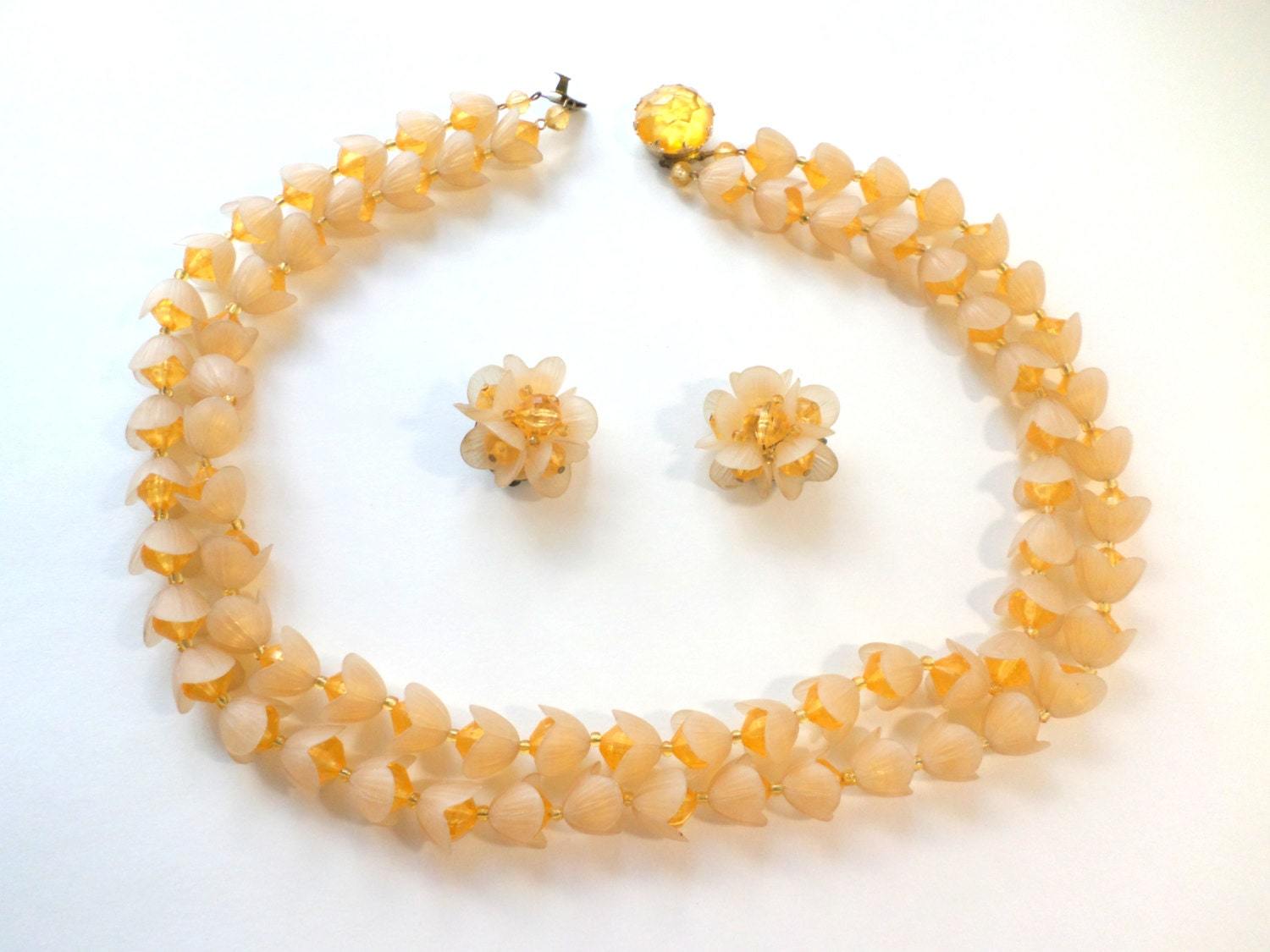 - Peach Lucite Petal Bead Necklace & Clip Earrings, 1950s West Germany