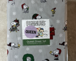 Peanuts Christmas Queen Sheet Set Snoopy Woodstock Santa Claus Wreath Lights. Gray