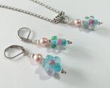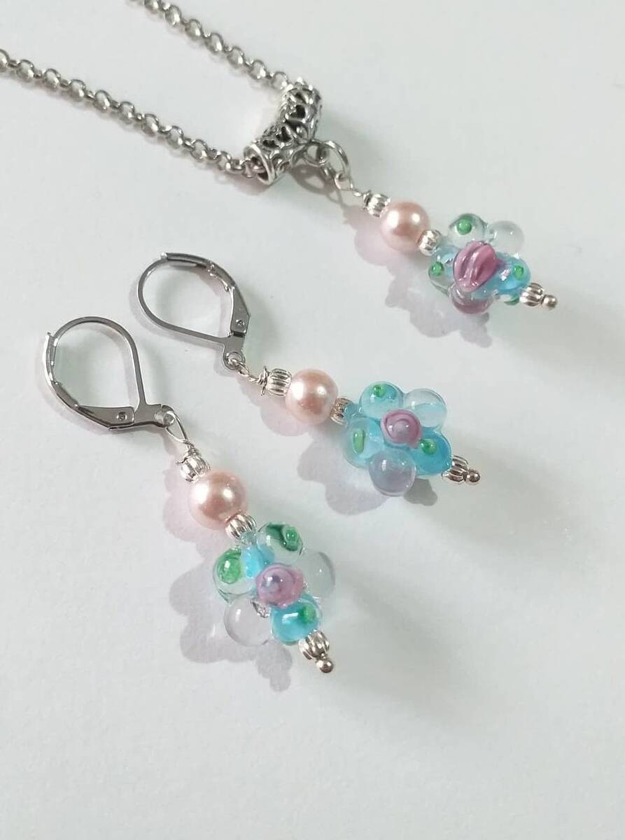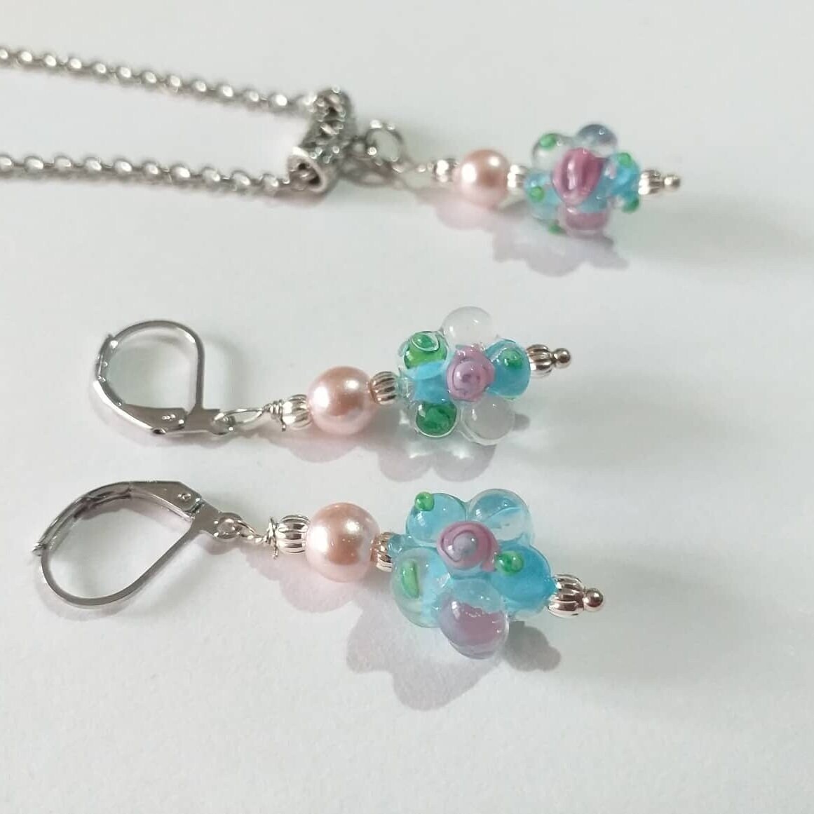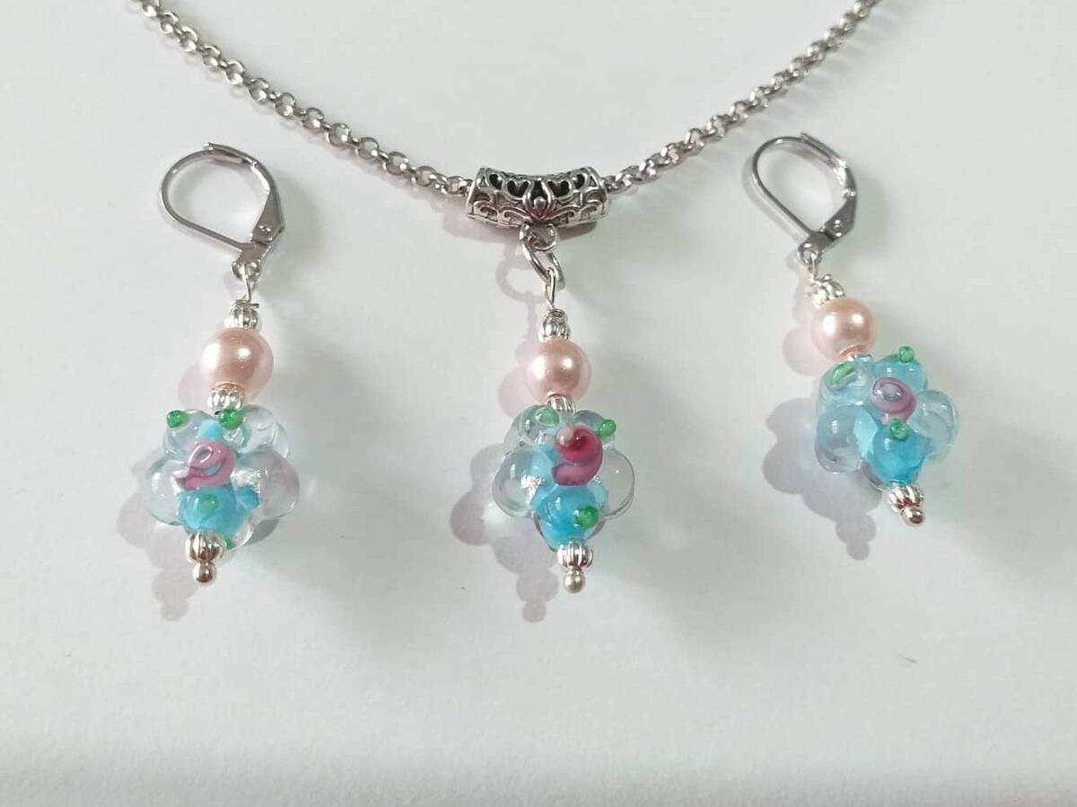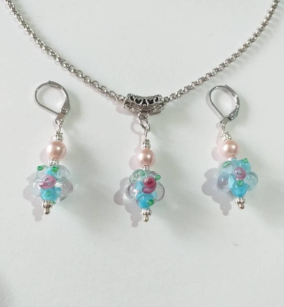 Gorgeous jewelry set earrings and necklace made of handmade Murano glass flowers in blue and rose pink tones. Victorian set necklace earrings Bohemian necklace and earrings .