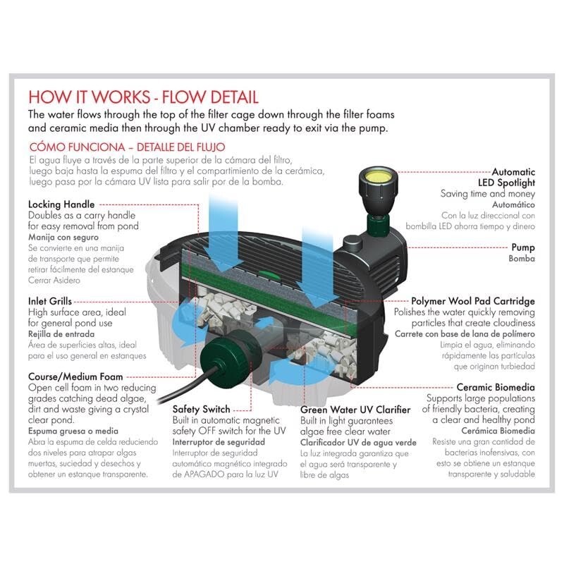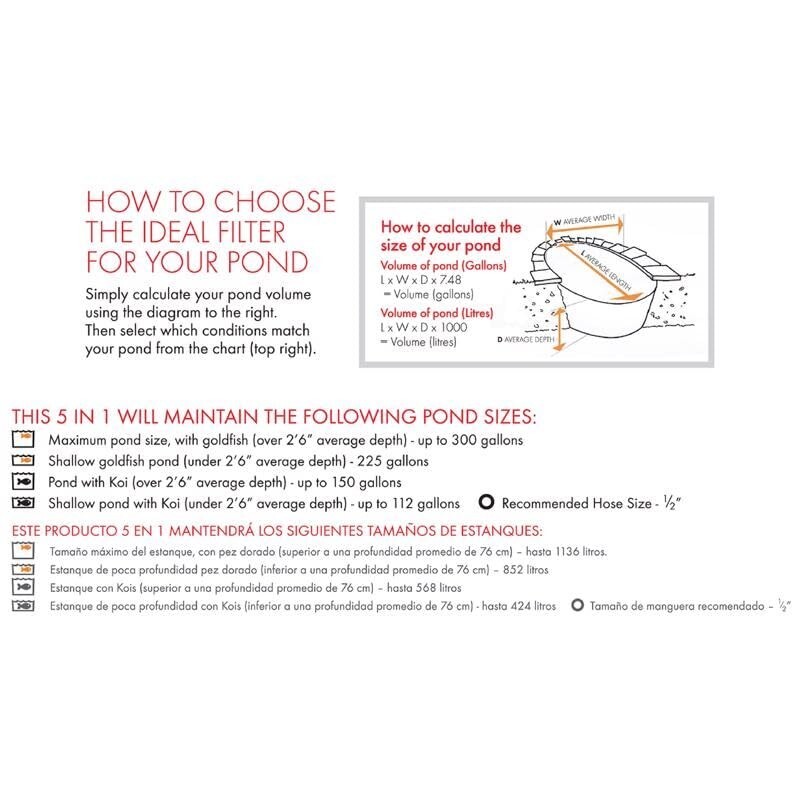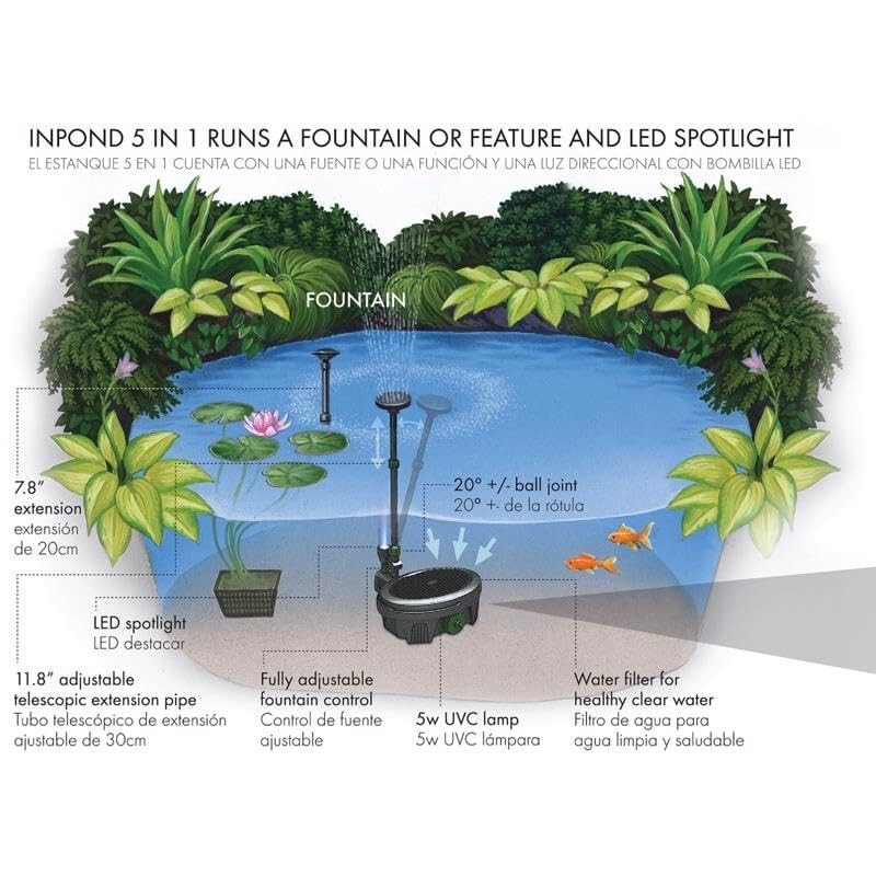 Create the perfect environment for letting your fish and pond life thrive with this all in one, complete, pond filter and submersible pump kit. Keep pond maintenance to a minimum while the filter traps dirt, the integrated UV kills green water and guarantees clear water. The extra time on your hands means you can enjoy the beautiful fountain morning, noon and night with the led light. Features. Instant pond makeover everything to keep your small pond clear, clean and healthy. 16 ft cable for the pump with LED light and the UV clarifier. Simple to maintain, easy clean filter rinse the foams and replace the polymer wool pad. Bio start for healthy water, eats pond sludge. Reduces filter cleaning, makes tap water safe. Stabilizes PH for healthy fishSpecifications. Color Black. Height 3. Horsepower 0.4 HP. Length 1. Maximum Discharge Flow 190 gph. Maximum Pumping Height 3. Volts 120 volt. Width 1. Country of Origin United Kingdom. Weight 12.1 lbs