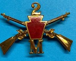 With red colored enameled keystone symbol in center with number above crossed rifles and with Company letter below. Screw style attaching disc on reverse.
