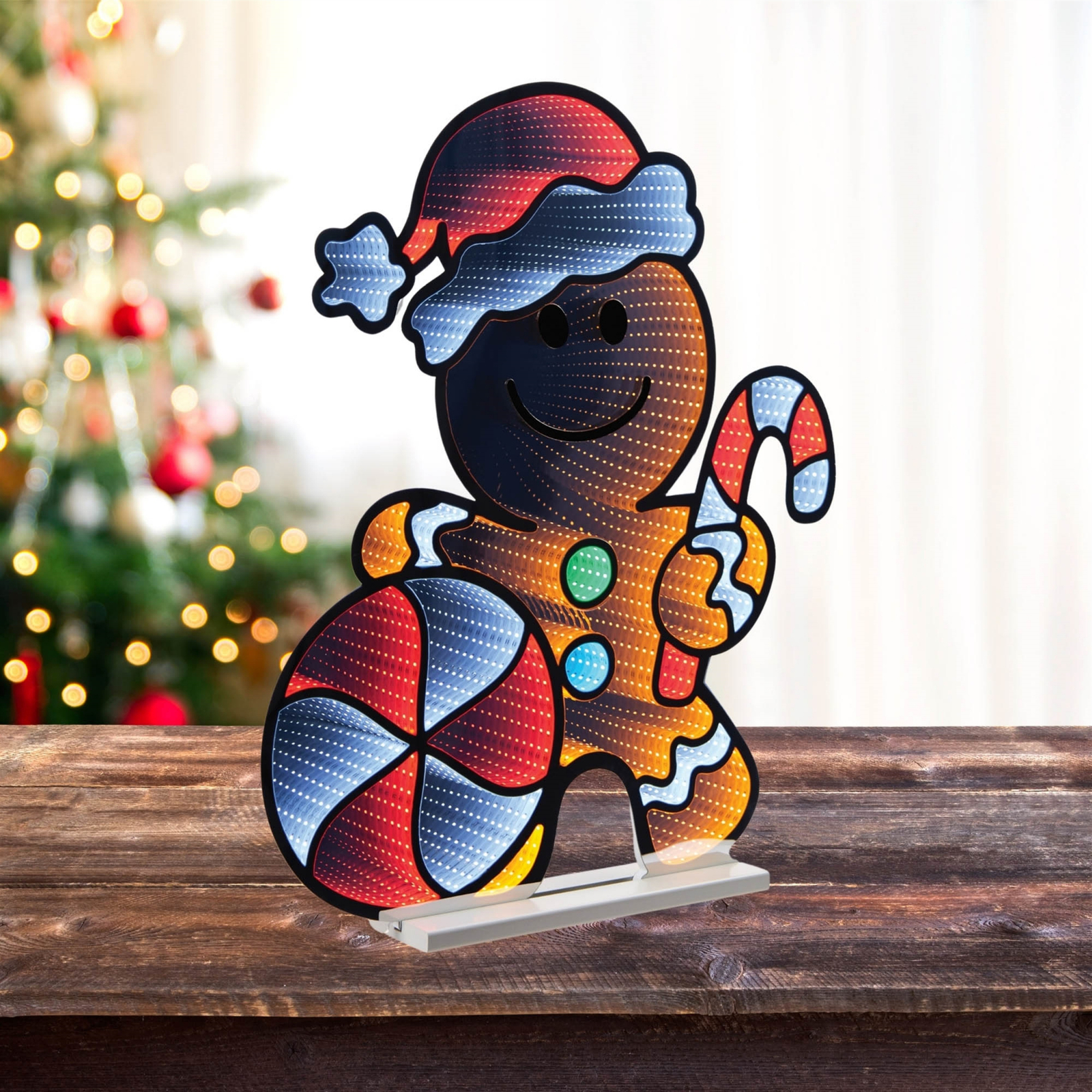 Festive Gingerbread Man Design Traditional gingerbread man with a brightly colored peppermint and frosting. Infinity Light Effect Glowing lights that appear to extend endlessly, creating a captivating display. UL Plug Powered Convenient plug-in setup for ease of use and reliability. Suitable for indoor or outdoor covered use only