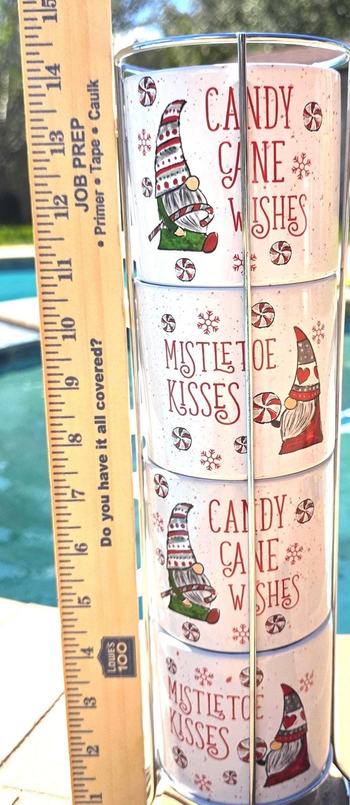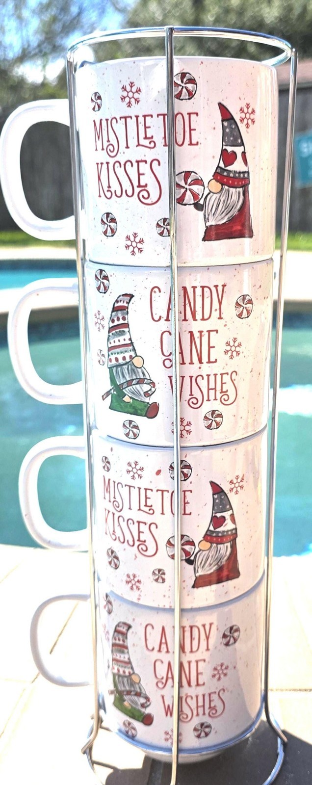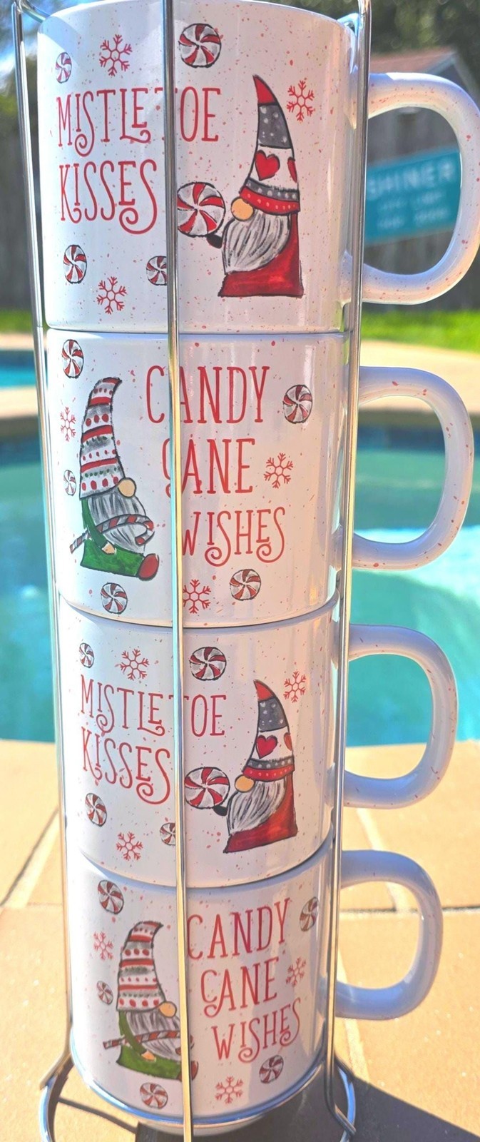 Peppermint Pine Holiday Stackable Gnome Mugs. 16 oz. Set Of 4. With Storage Rack