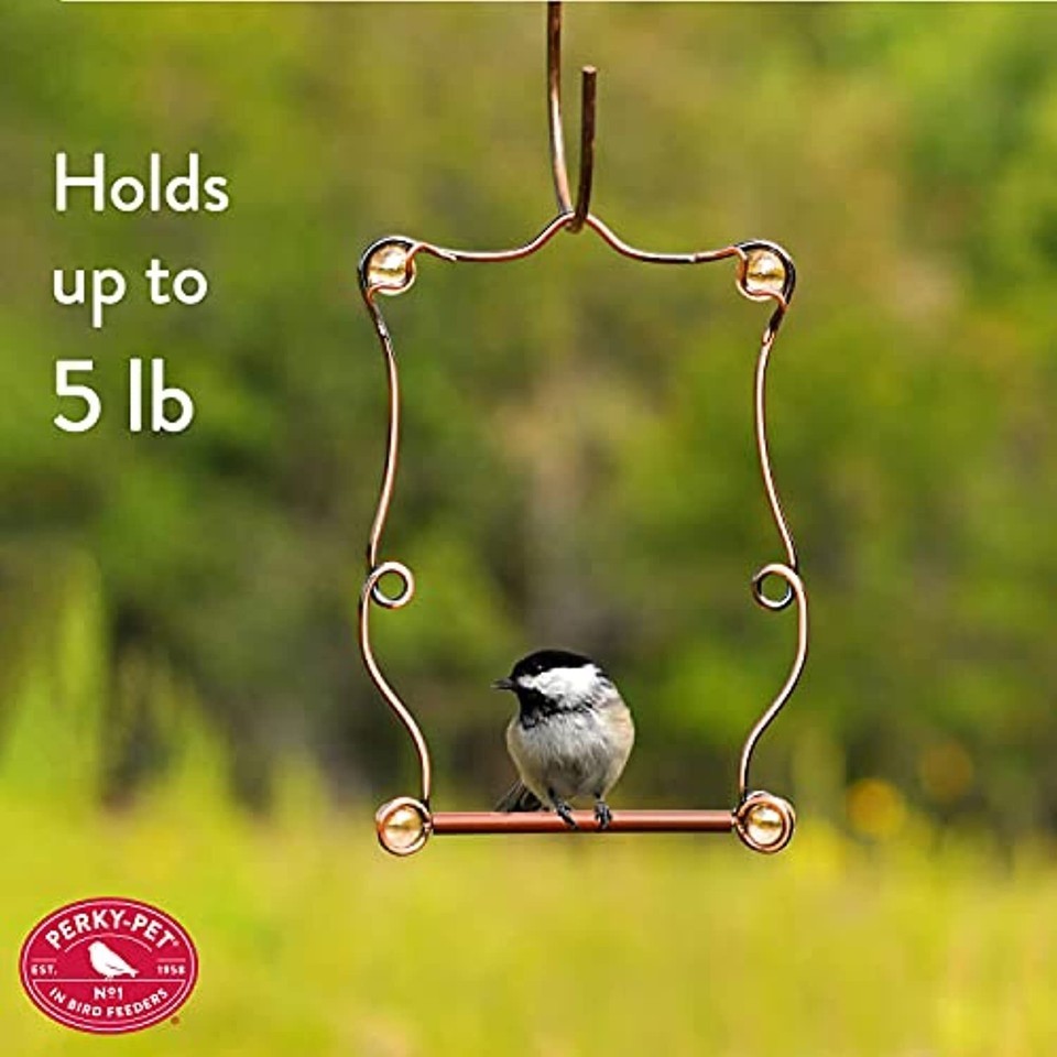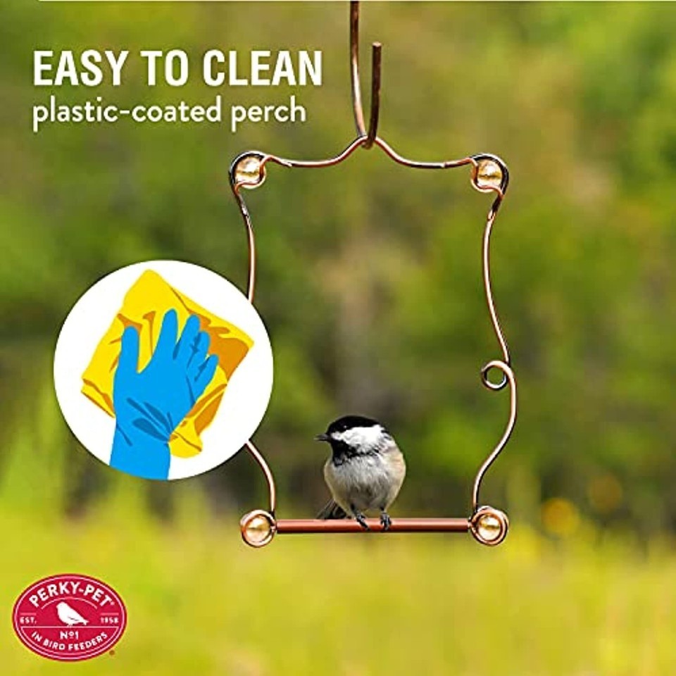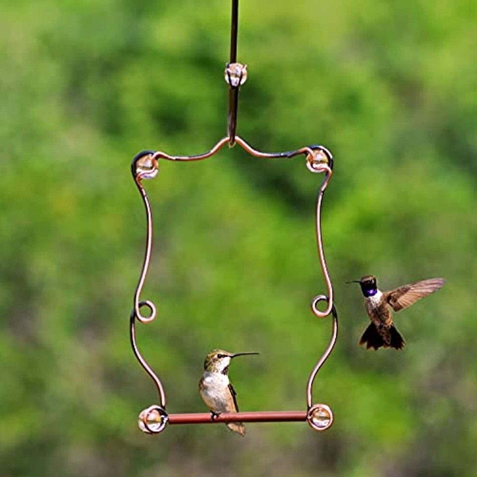 This Perky-Pet Beaded Copper Hummingbird Perch is an elegant addition to your array of hummingbird accessories. Simply hang near your feeders or close to nectar-producing flowers and soon you'll see the little dynamos making use of it. Hummingbirds will use the perch to wait for an opening at your feeder and flowers or to take a break after they've had their fill of nectar. It's also good to position one of these perches near water sources too, since birds of different species will often avoid congregating in bird baths at the same time. Hummingbirds will wait for time at a nearby feeder Real Copper frame with rose-tinted beads Easy to clean plastic-coated perch Hang from a matching Perky-Pet Copper Decorative Beaded Hanging Hook Translucent rose beads Perfectly frames birds for photography Specifications: 5" x 7.25" The perch, which measures about 5" wide and close to 7.25" tall isn't just for hummingbirds either. Any bird will be happy to use it for a resting spot since it provides an unobstructed view in all directions.For photographers, the perch also provides an opportunity for picture-taking! Birds are likely to remain on the Beaded Copper Hummingbird Perch for a minute or two, and that means they will be sure to strike just the right pose!Features: Copper frame Plastic-coated perch area Translucent rose beads. Hummingbirds Prefer: Perches and feeding stations out in the open to watch for danger Clean feeders filled with fresh nectar Nearby sources of water to drink and bathe in 100% sucrose solution nectar, which digests more like live flower nectar FAQ's:How can I take great bird photos with a smartphone? The Perky-Pet Beaded Copper Hummingbird Perch is a great "photographer's assistant," since you get to choose its location and placement. That means you can set it up in a convenient place for snapping photos while your visitors rest. Taking good pictures with a smartphon