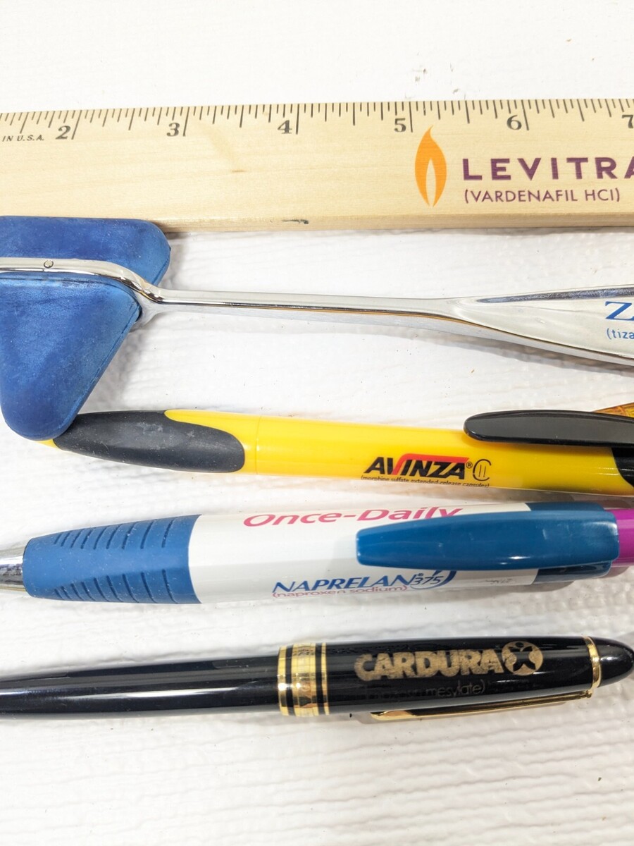 Pharmaceutical drug promo rep pen ruler hammer SET Altace Amitiza Levitra Avinza Some items have marks/stains/wear/discoloration from use. Some pens may not work/write. Includes: Levitra Ruler Zanaflex Hammer Pens: Altace, Amitiza, Levitra, Avinza, Naprelan, Cardura