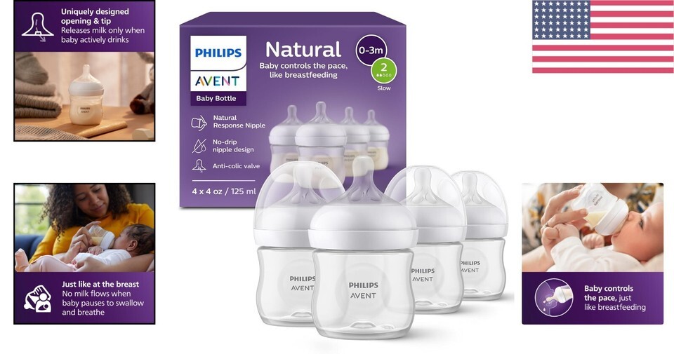 - Philips 4oz Natural Baby Bottles, Anti-Colic with Slow Flow Nipples, 4-Pack