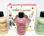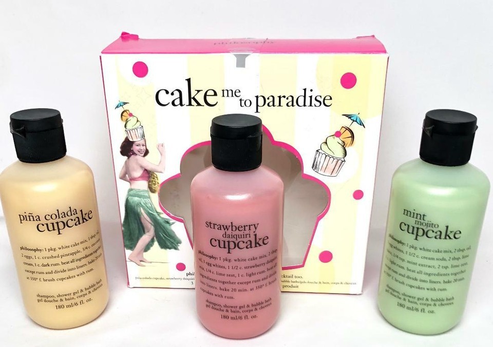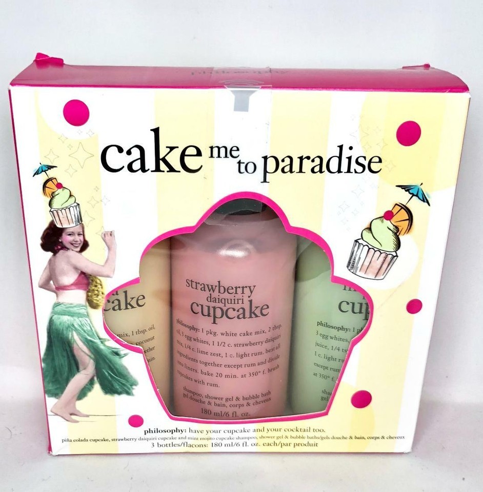 This is a great brand new Philosophy Rare discontinued set. The Cake Me To Paradise set contains 6 oz bottles of the rare scents Mint Mojito Cupcake, Strawberry Daiquiri Cupcake, and Pina Colada Cupcake. All brand new and sealed.