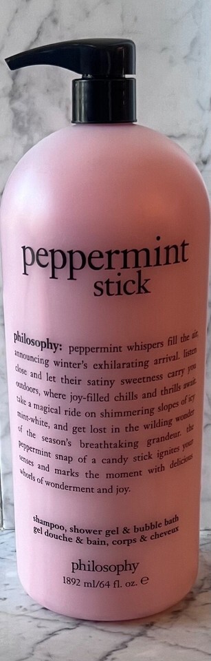 Brand new in box huge 64 Oz size bottle of Philosophy Peppermint Stick shower gel. Pump included and already inserted into bottle. Guaranteed unused.