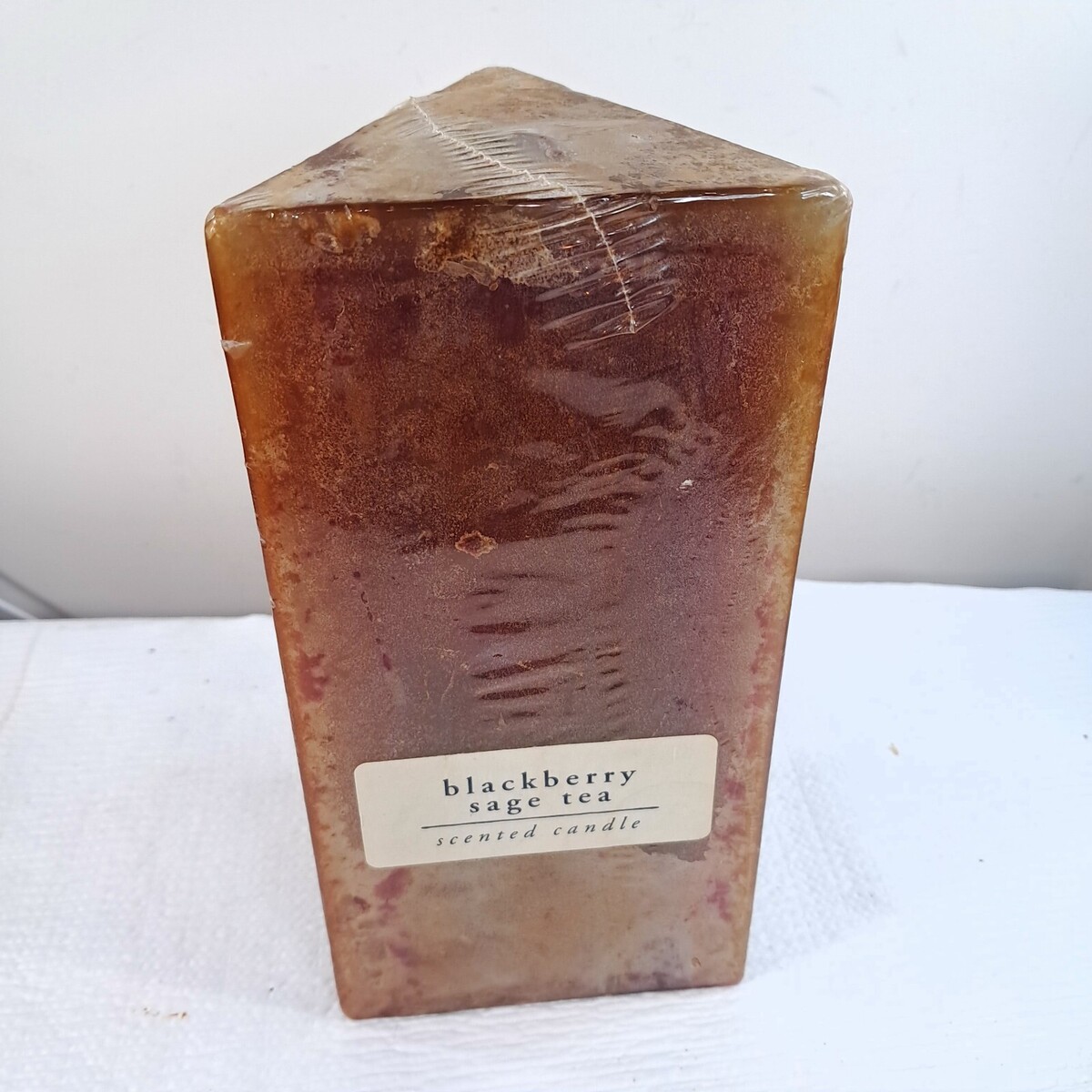 Pier 1 BLACKBERRY SAGE TEA Pillar Candle TRIANGLE SHAPED Pillar boho Vintage Large multicolored candle. See pics for colors. Some wear from storage, mostly just a ding on one corner as shown.