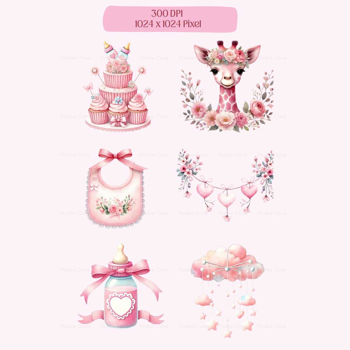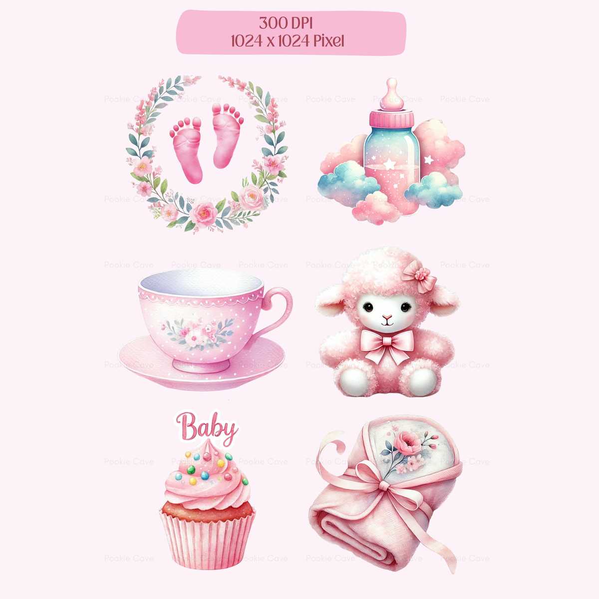 Pink Baby Shower Watercolor Clipart Bundle: 30 PNG Designs (Digital Download)
