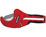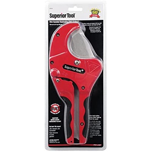 Superior Tool 2" PVC Ratcheting Cutter cuts 2" nominal PVC pipe, or 2.5" O.D. (63mm). One-handed operation, frees up the other hand to hold the work. Aluminum cast handles with cushion grip for comfort. Durable powder coat finish for easy clean up. Hardened stainless steel blade design with pointed edge to pierce the pipe for smooth effortless cut. Cuts 2" nominal PVC pipe, or 2.5" O.D. (63mm) One-handed operation Aluminum cast handles with cushion grip Durable powder coat finish Hardened stainless steel blade design with pointed edge