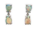 A pair of platinum Australian opal stud earrings with dangle drops. There are four pear shape cabochon opals measuring about 7mm x 5mm. The opals weigh 1.95 carats total. The earrings are pierced post with clutch back and measure a little over 5/8" long. The opals have primarily pink and green, but very lively with all colors of play of color.