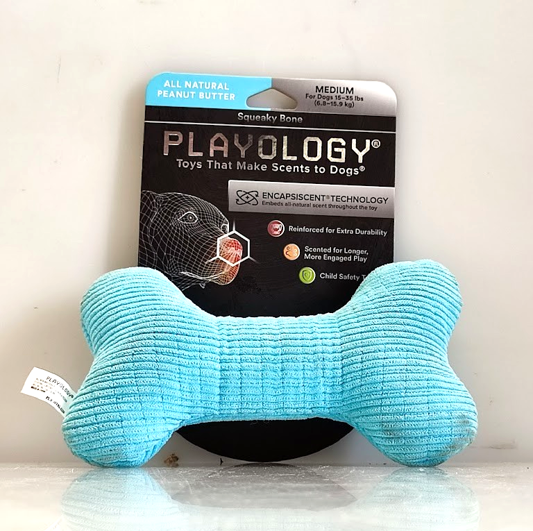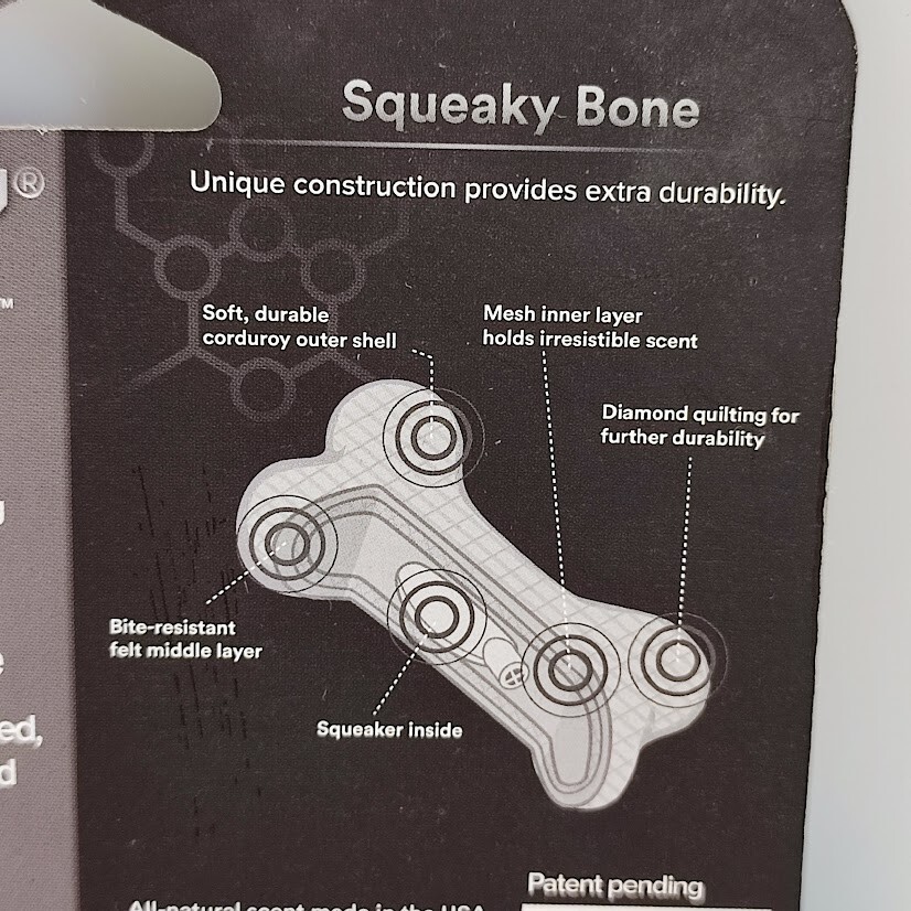 MEET THE PLUSH SQUEAKY BONE: With a bite-resistant felt middle layer, a soft and durable corduroy outer shell, and a fun squeaky feature, this plush bone toy has everything your pup is looking for! The diamond quilting provides maximum durability, and the mesh inner layer holds an irresistible all-natural Peanut Butter scent to keep your pup playing and chewing 7x longer than unscented plush toys. The Medium size is ideal for dogs up to 50lbs.
