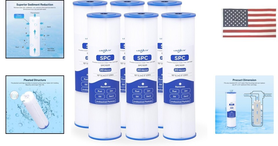 Pleated Sediment Water Filter Replacement Pack, 20 Micron, 10" x 2.5", Washable, Whole House/Well Water, 6-Pack - New