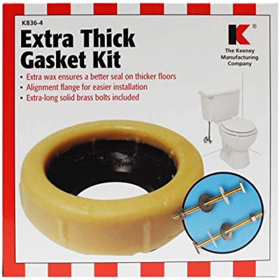 Keeney's jumbo wax toilet gasket with extra long bolts is a heavy duty wax ring for use with 3 inch or 4 inch waste lines. Other features include solid brass snap off bolts, extra thick gasket, high melting point - 163F.