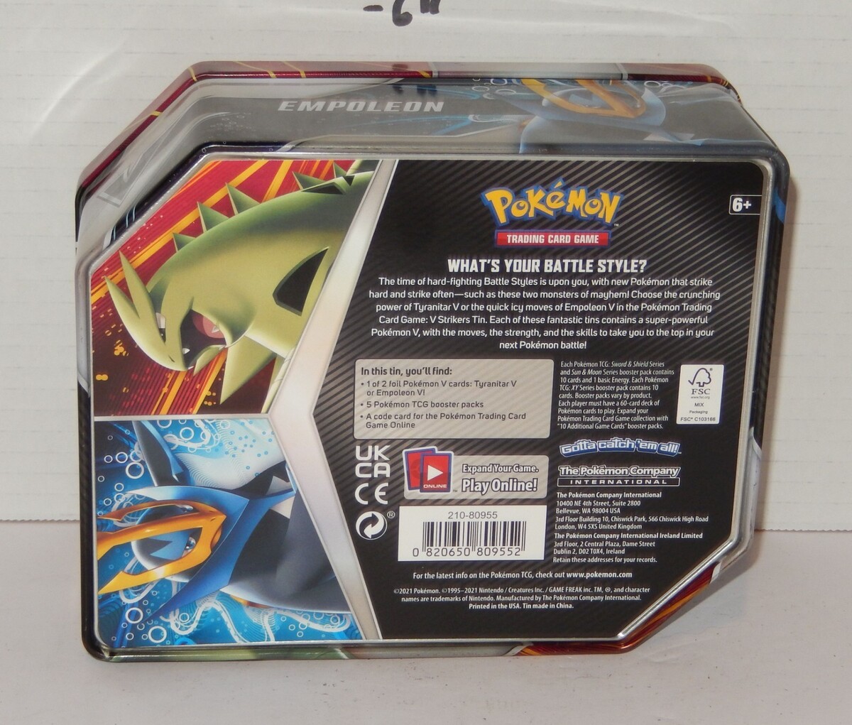 For Sale is a Pokemon TCG 2021 V Strikers Tyranitar Tin EMPTY Red Green Yellow! Its In good USED condition. It includes whatever is in the pictures provided. Please ask Any and All Questions prior to purchasing. Great For Carrying Your Pokemon Cards around in. Fast Same or Next day shipping with Free Delivery Confirmation within the U.S. Payment Due within 7 days of purchase (if you need more time please let us know In advance) we love to combine shipping is always a Yes and Most of the time Additional Items Ship for free. SKU4MS