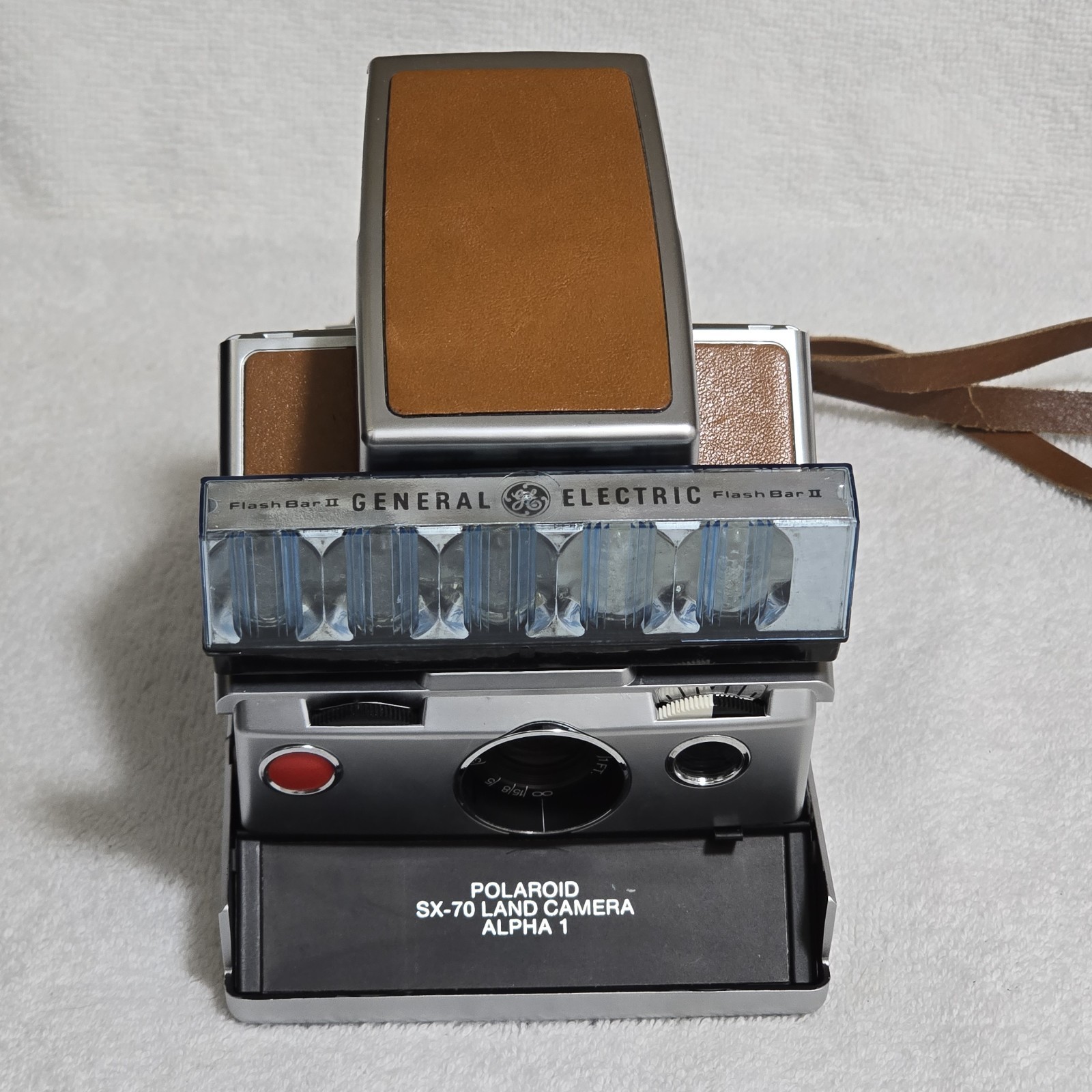 Excellent Condition Polaroid SX-70 Land Camera Alpha 1 + Black Leather Case with Strap (Has wear along the top edge) + GE Flash Bar + Manual Tested and Works Great. SMOKE FREE HOME! SUPER FAST SHIPPING! 5-B