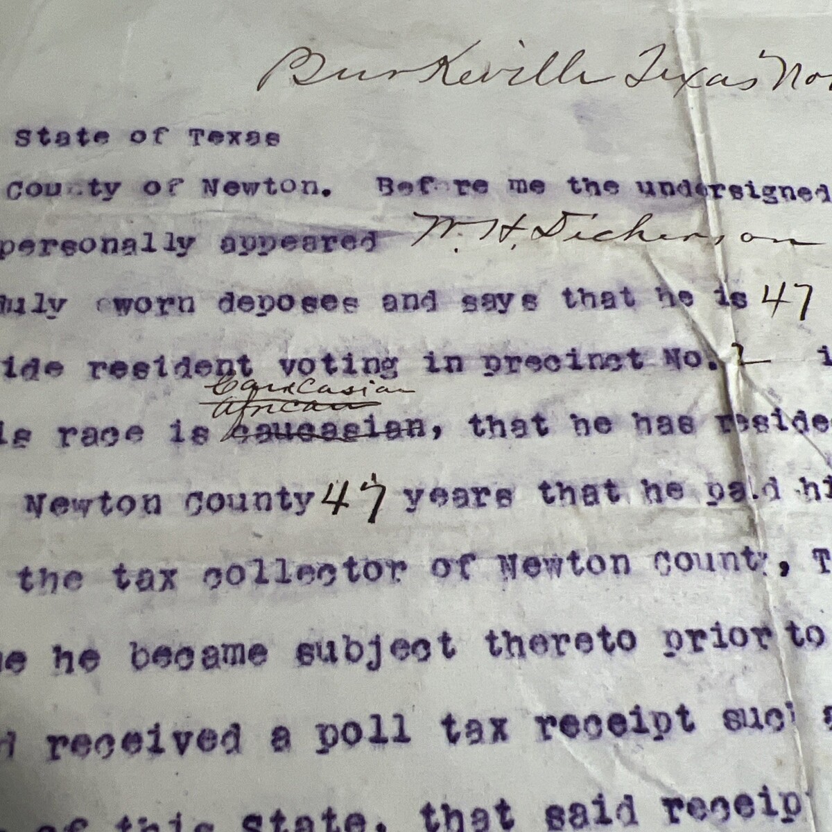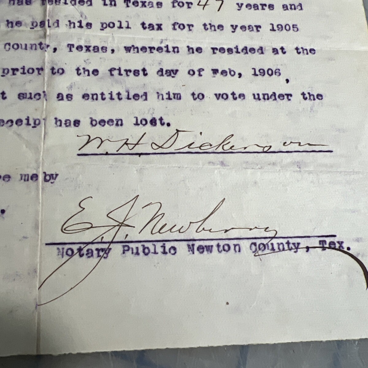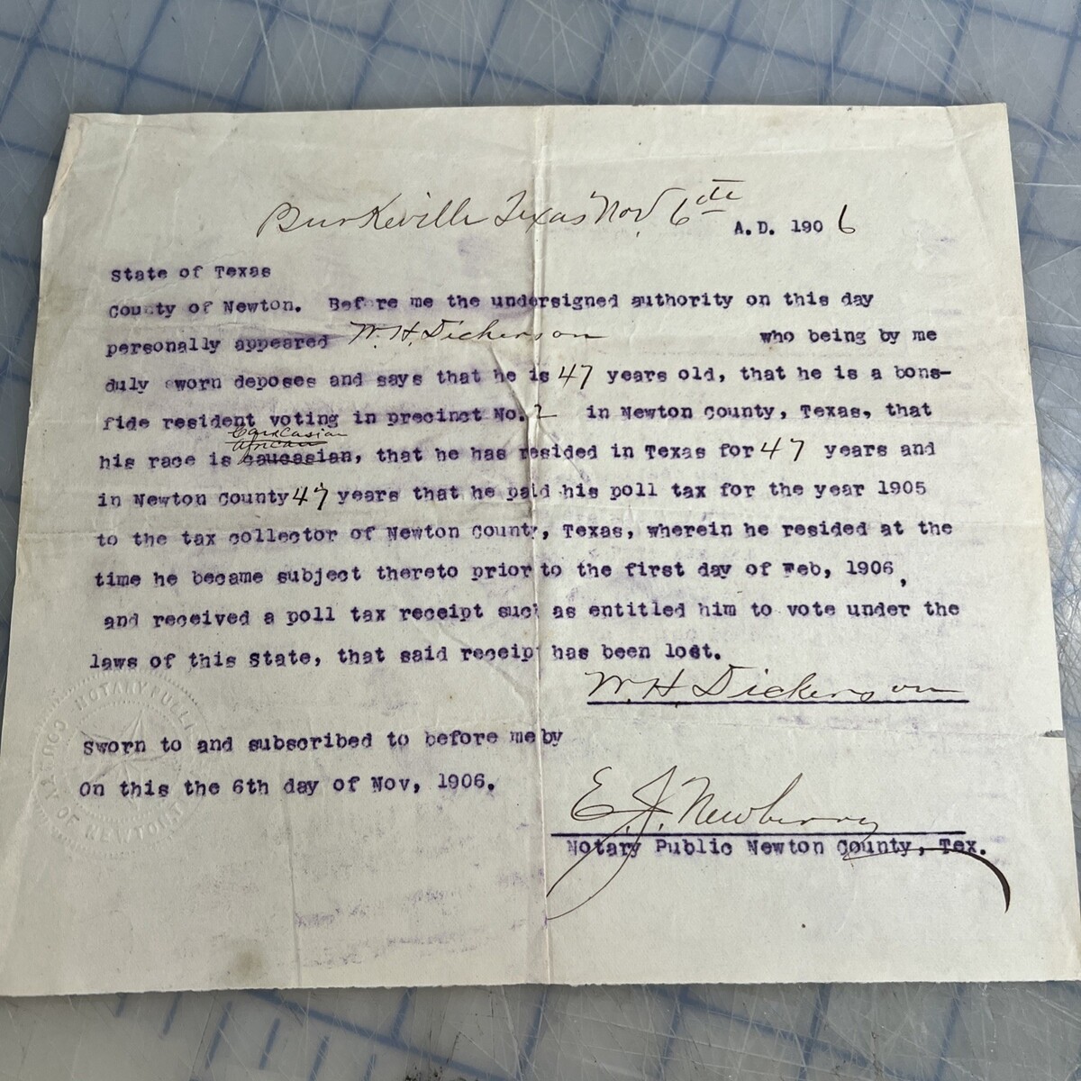 - Poll Tax Document Receipt 1906 Burkeville Texas Newton County