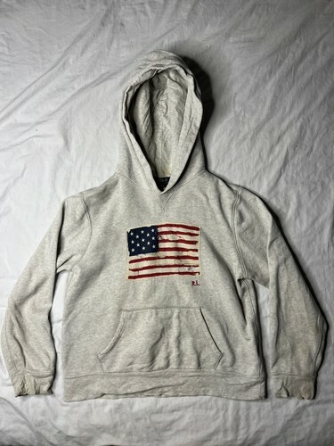 Polo Ralph Lauren American Flag Pullover Hoodie Youth Large 14-16 Gray Pocket