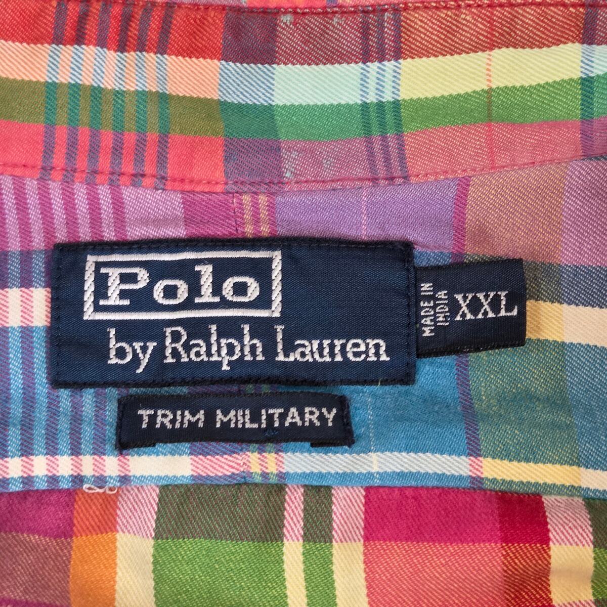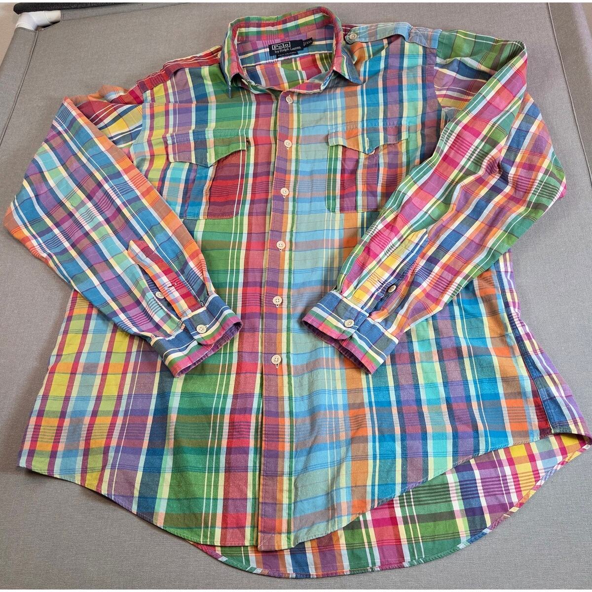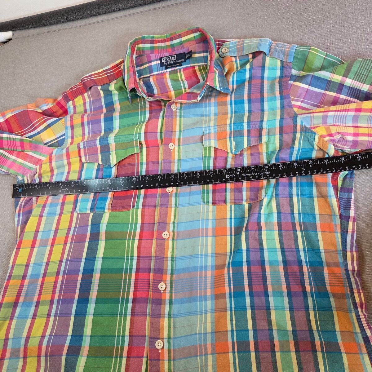 Vibrant Polo Ralph Lauren Trim Military Fit button-down in classic madras plaid. Made from lightweight cotton with button cuffs and embroidered logo. Note: small hole/wear spot on the back of right arm (shown in photos). Size XXL Made in India 100% cotton Trim Military Fit Long sleeves, button cuffs Multicolor madras plaid pattern Length 30", pit to pit 25.5", sleeve 27" Small flaw on back of right arm (see photo)