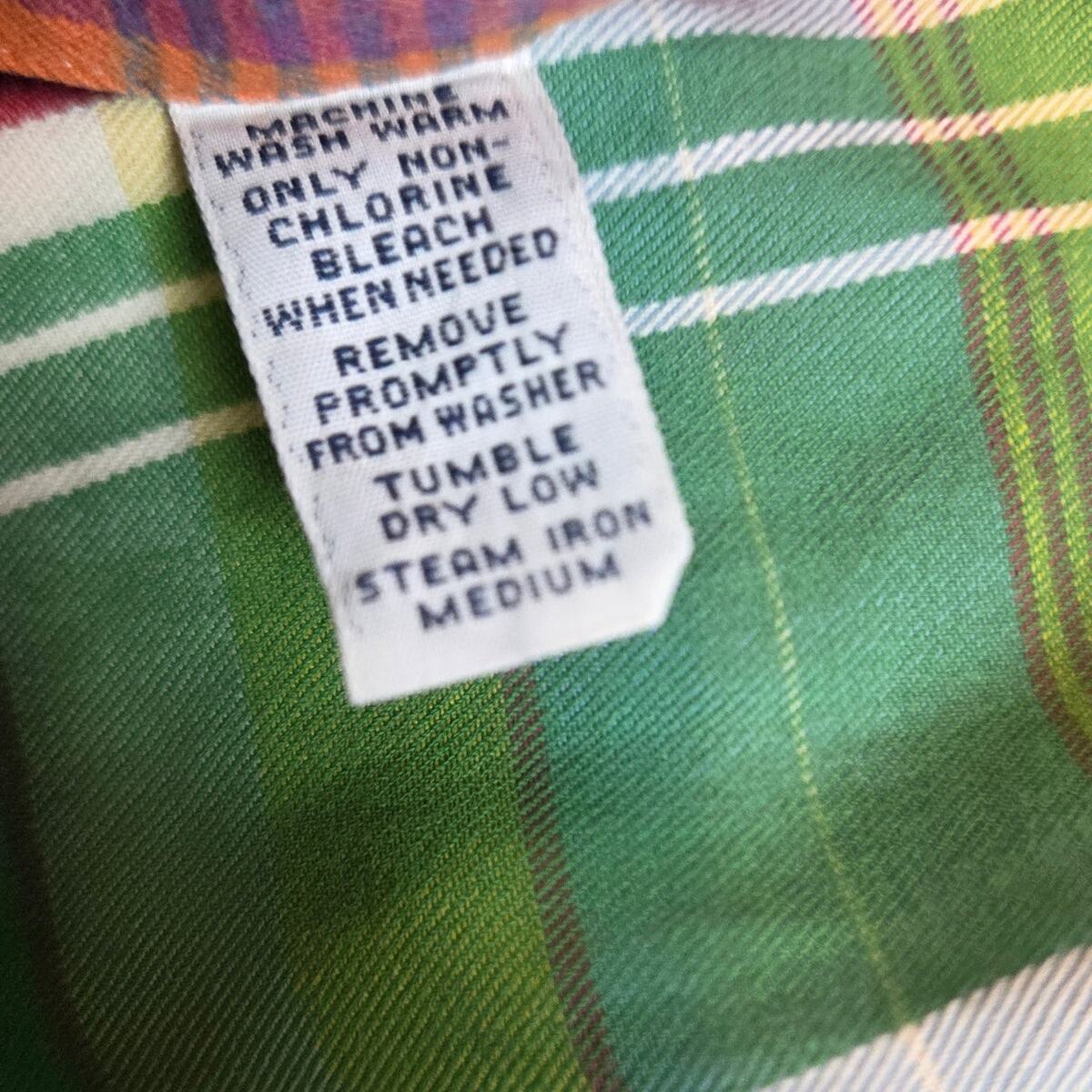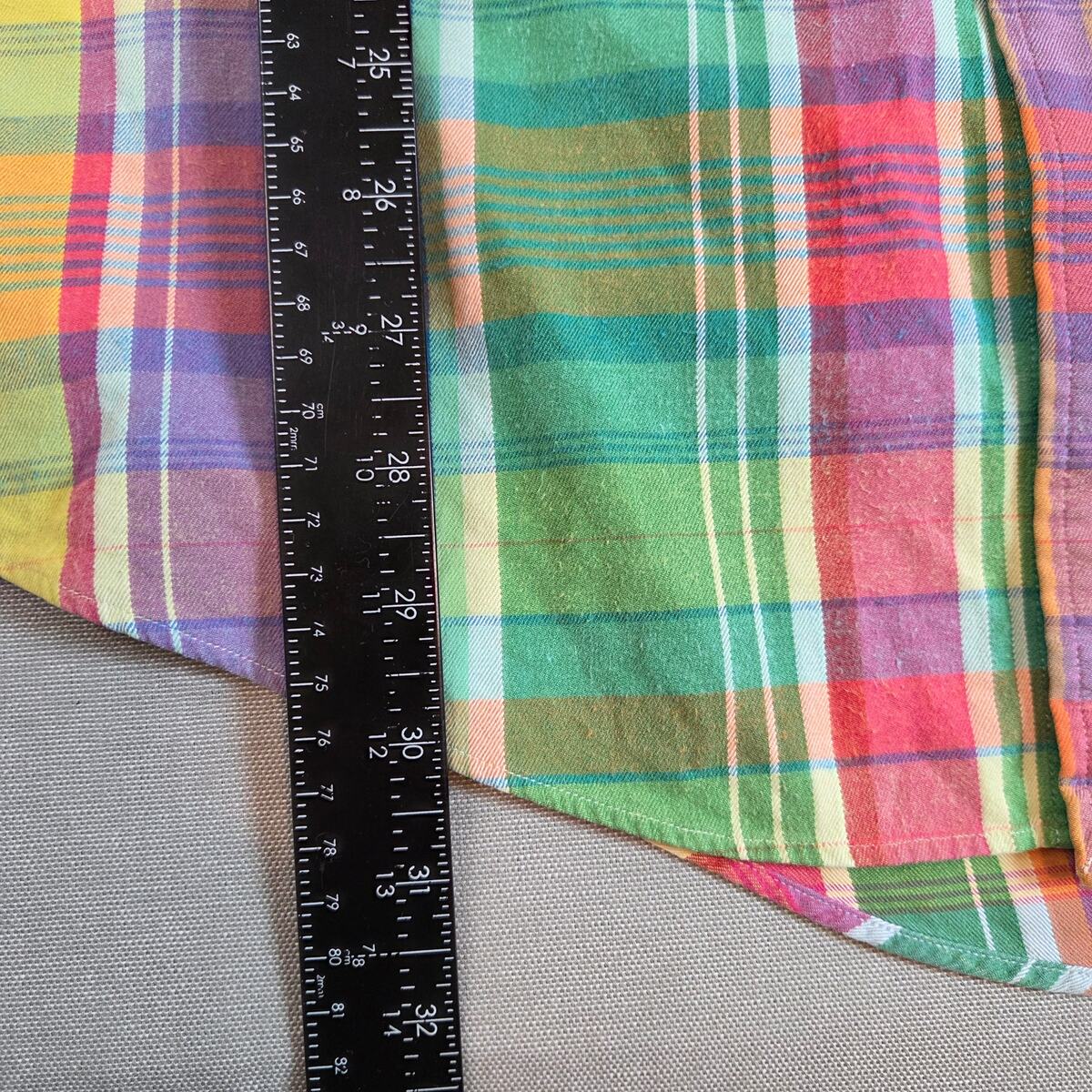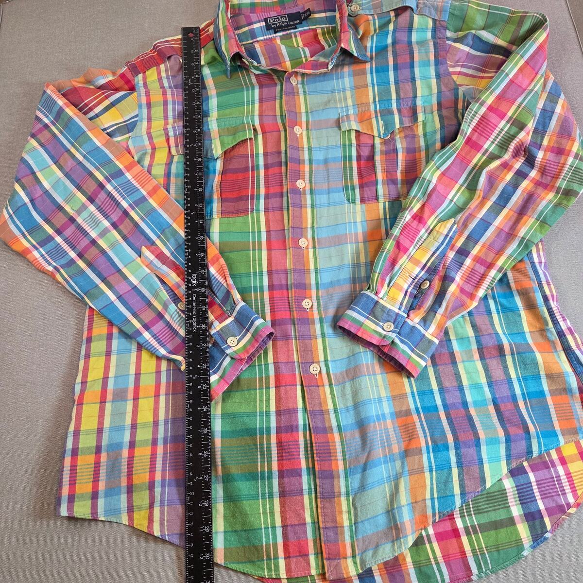 Vibrant Polo Ralph Lauren Trim Military Fit button-down in classic madras plaid. Made from lightweight cotton with button cuffs and embroidered logo. Note: small hole/wear spot on the back of right arm (shown in photos). Size XXL Made in India 100% cotton Trim Military Fit Long sleeves, button cuffs Multicolor madras plaid pattern Length 30", pit to pit 25.5", sleeve 27" Small flaw on back of right arm (see photo)