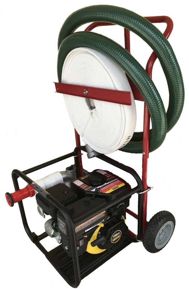 Protect your home and property from a wildfire using your swimming pool water. Package includes a Portable Pool Fire Pump Cart on wheels with a 6.5 HP gas fire pump, 100 feet of high quality single jacket fire hose, nozzle, 12 ft. of PVC Suction Hose, all fittings hose adapters already assembled.