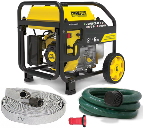 Package comes complete with the 6.5 HP gas fire pump, 100 feet of fire hose, nozzle (fog to stream settings) , 12 ft. of 2" Suction Hose (high quality pvc for maximum flow rate!), cover, all fittings above, and deluxe wheel and handle system for easy portability and storage.