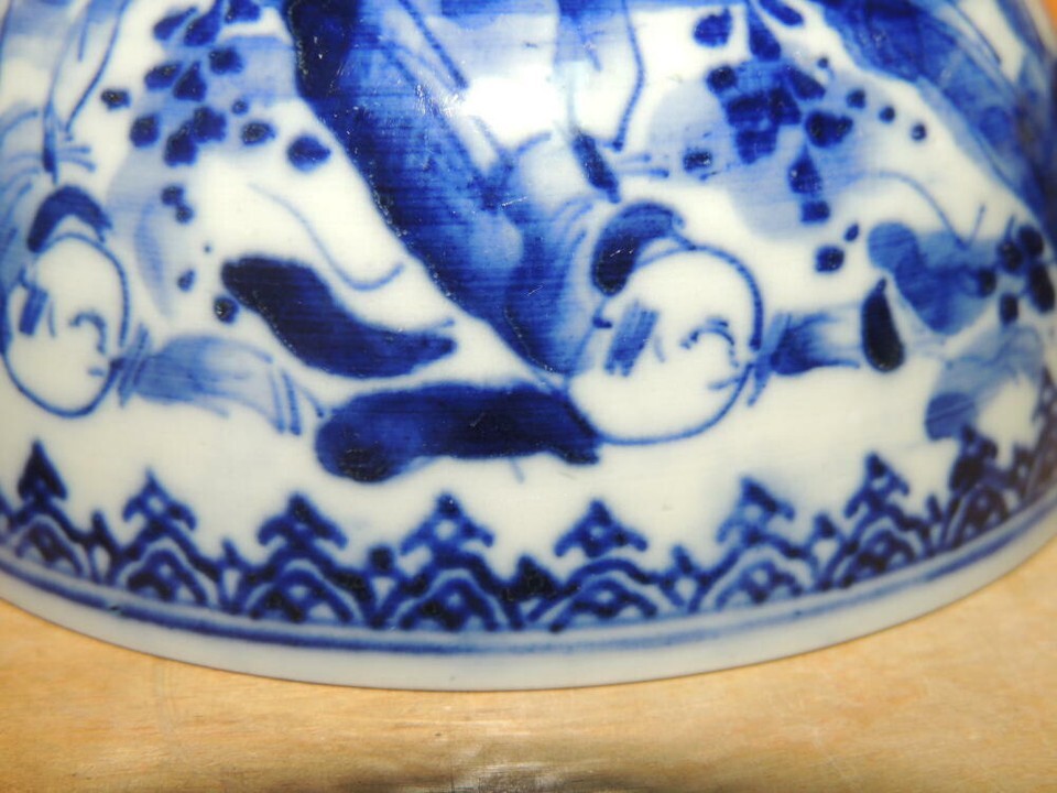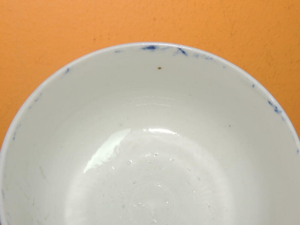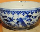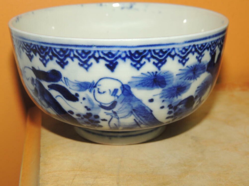 - Porcelain Bowl 4.5" White& Cobalt Blue old man walking staff Japanese Antique