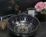 Product description: Transform your bathroom into a designer showcase with this striking black porcelain vessel sink by Interoknack. The artistic flower and scrollwork pattern creates a luxurious visual statement that elevates any vanity space. Measuring 16.2 inches in diameter with a 5.9-inch height, this round ceramic basin features elegant scalloped edges that add sophisticated charm to bathrooms and powder rooms. The high-gloss, hand-crafted porcelain construction ensures exceptional durability, scratch resistance, and easy maintenance while maintaining its vibrant appearance for years. Designed for above-counter installation, this statement piece complements both modern and transitional style vanities. Compatible with standard 1.77-inch drain fittings (not included), this artistic basin brings boutique hotel elegance to your home. Perfect for interior designers, premium renovations, or anyone seeking to make a bold design statement in their bathroom.