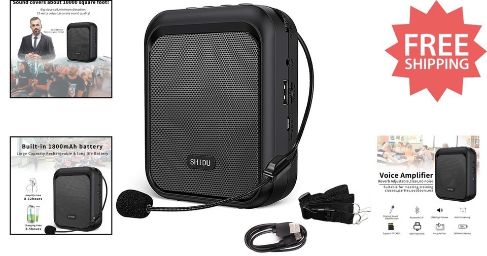 Experience powerful, crystal-clear sound with our versatile Voice Amplifier, featuring a 10W output that covers up to 10,000 square feet?ideal for groups of 40-100 people. It doubles as a portable Bluetooth speaker, streaming music from any Bluetooth-enabled device within 33 feet. Compact and lightweight (3.1 x 1.2 x 4 inches, 0.4 lbs), it easily clips onto your belt or hangs around your neck for effortless portability. Enjoy long-lasting use with a 1800mAh rechargeable battery providing up to 12 hours of MIC mode and 6-8 hours of music playback on a full charge, taking only 3-5 hours to recharge. The adjustable wired headset ensures comfortable operation, making it perfect for teaching, coaching, tours, presentations, and outdoor events. Simple to operate?just plug in the headset and turn it on?this voice amplifier is especially beneficial for seniors or anyone needing vocal assistance.