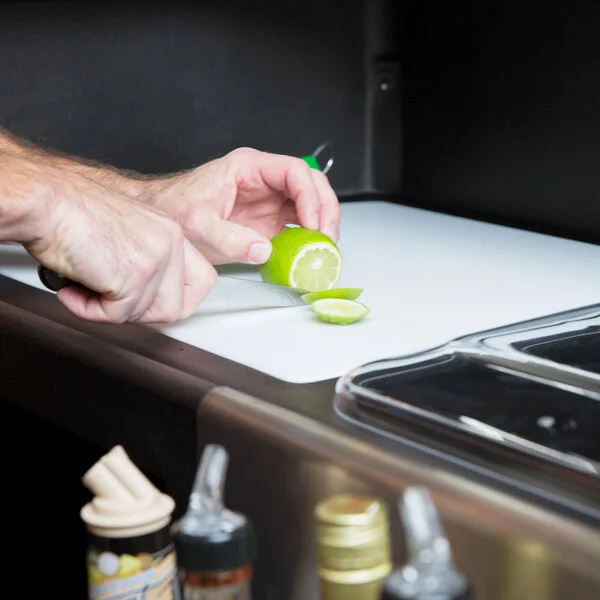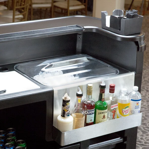 With lots of storage space, your prep tools, ingredients, mixes, garnishes, ice and glasses are all at your fingertips! A built-in cutting board allows for easy garnish preparation and can be removed for cleaning, while a removable, sliding storage drawer accommodates mixers or sodas. A 15-gallon ice bin features an integrated drain and water trap, and includes a standard dust cover for sanitary storage and transportation. Use this portable bar in your banquet hall, hotel lobby, or for poolside, terrace, outdoor dining and more!