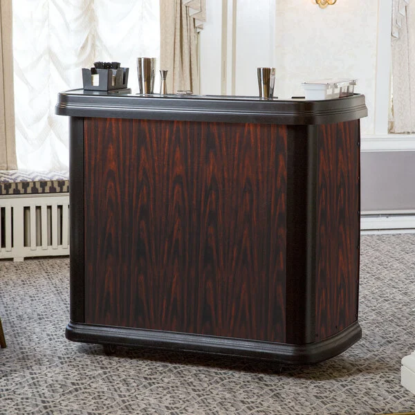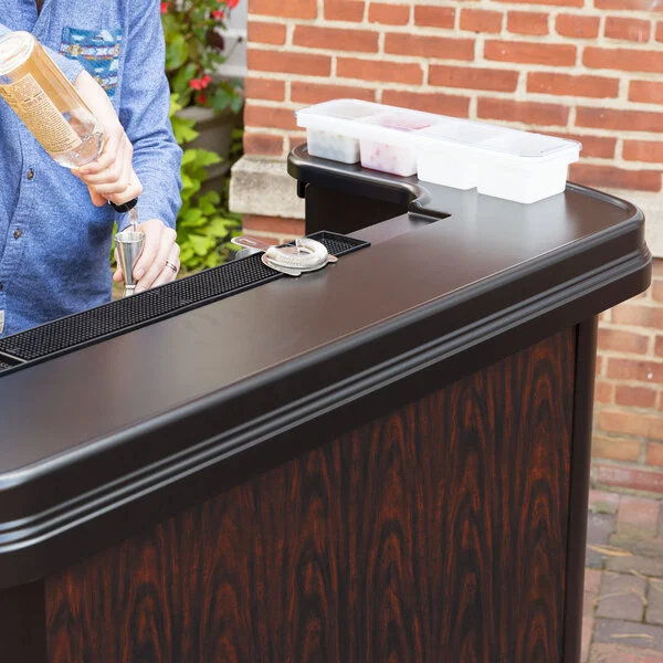 This cherry wood, 56" bar will blend in easily with any foodservice environment, and comes fully assembled. Designed for easy drink preparation and serving, this bar's molded countertop is easy to clean and includes a molded-in bar mat well, and its large surface area allows you to keep condiment caddies in reach without blocking the counter. This portable bar also features 5" non-marking swivel casters with locking breaks to hold the bar securely in place.
