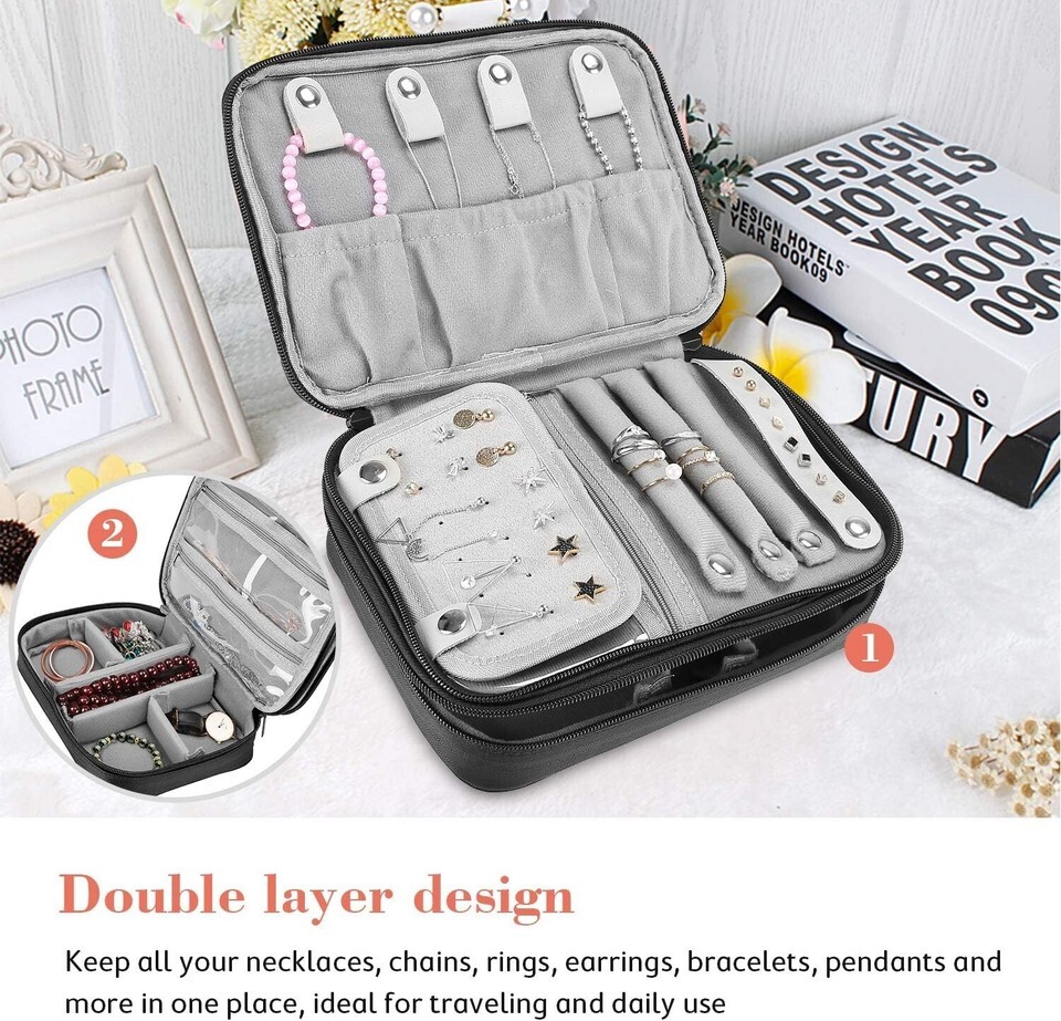 Features: Padded,Double Layer Design,Zippered Closure,Detachable Dividers,Earring Panel,Ring Row,Convenient Portability,Clear Zippered Pockets,Bracelet Necklace Snaps,Earrings Carrier Straps